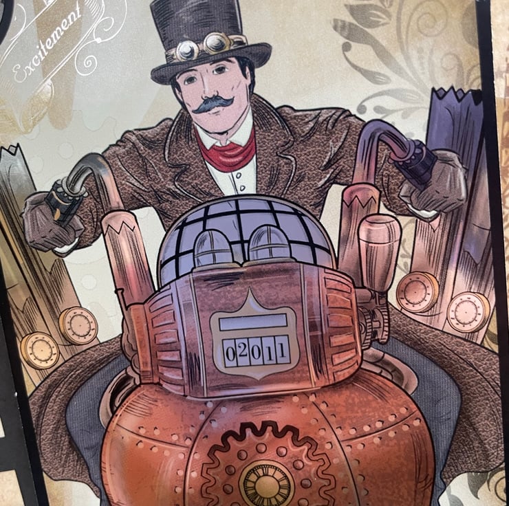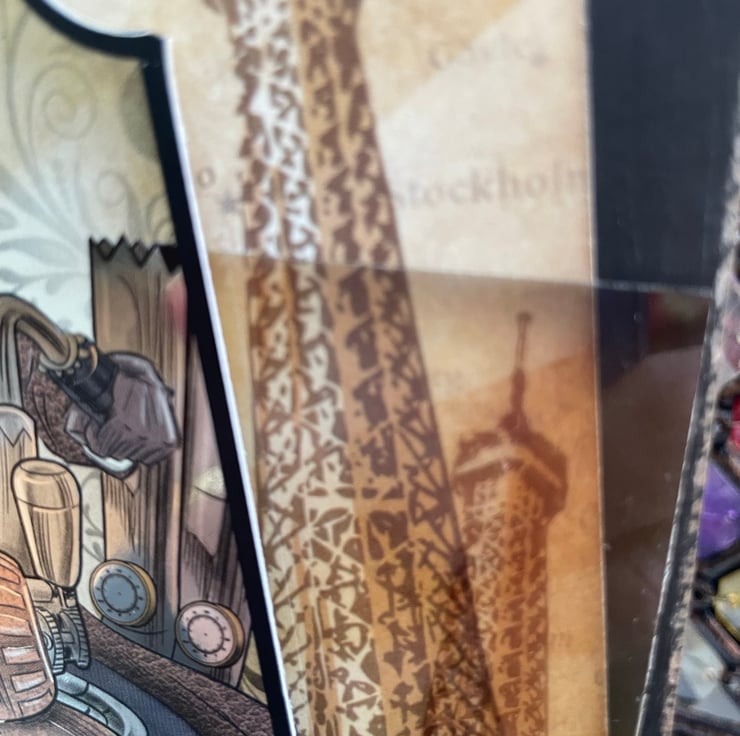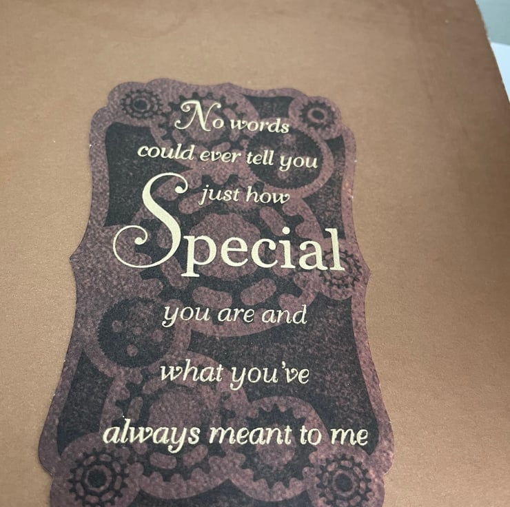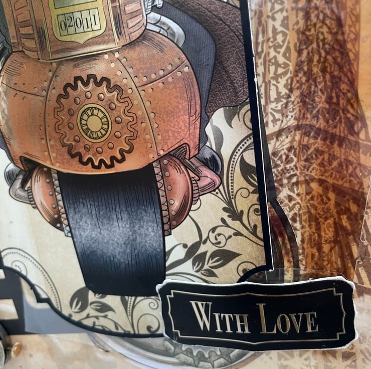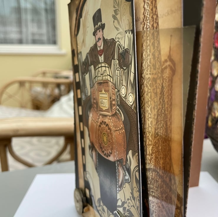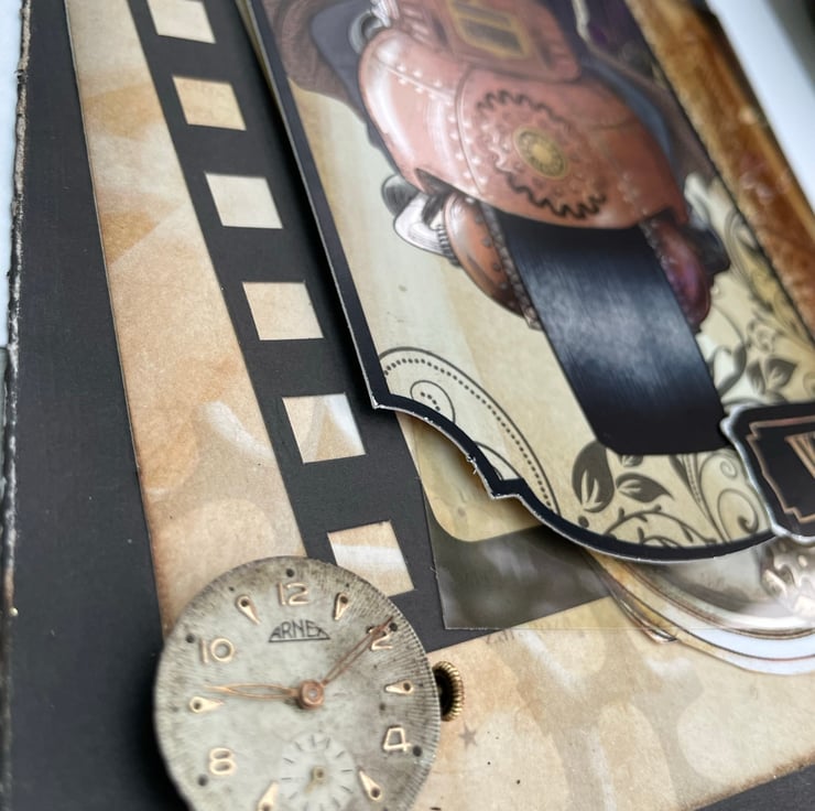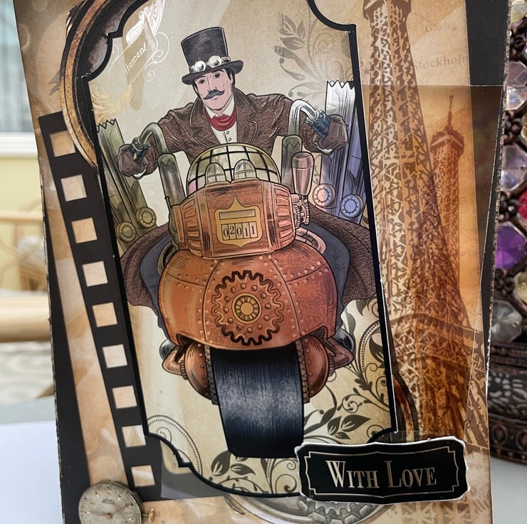 A truly individual card for a special Dad. This A5 sizes card is full of steampunk style. The base card is black with an inked Eifel tower scene. This is topped with a matching but smaller acetate image, a film style piece of card and varios steampunk embellishments. The main design features our time travelling hero on his steampunk motor bike. He is adorned with his top hat and goggles. the design is finished off with a With love sentiment and the card has an old watch workings to one corner. Inside the card has a sentiment that says No words could ever tell you just how special you are and what you've always meant to me, just a beautiful way to celebrate Father's Day.