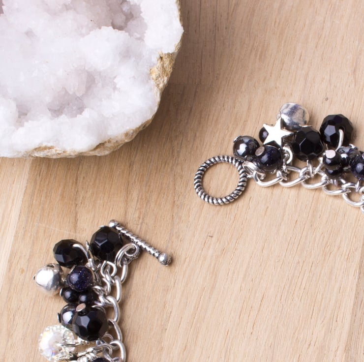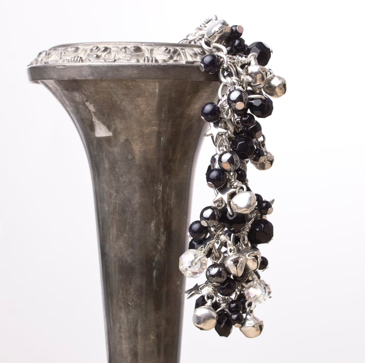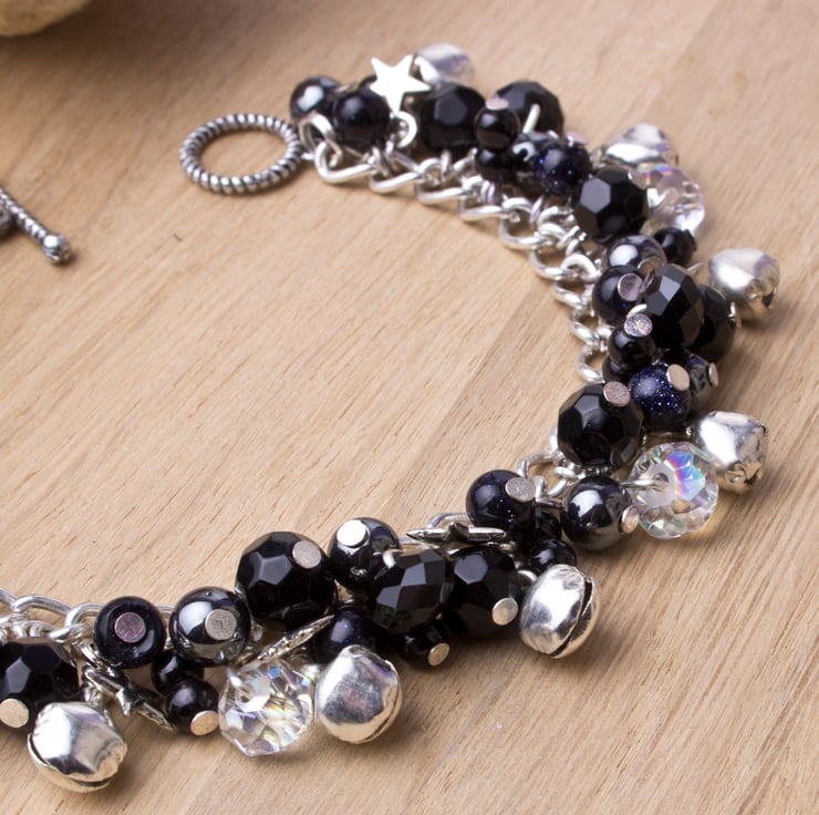A gorgeous collection of bells, stars, black and crystal AB (twinkle) faceted rondelles and beads are combined with stunning blue goldstone and shiny hematite gemstones. Wire wrapped and jam packed on a silver plated curb chain which is finished with a toggle clasp. Approximately 8 inches long and makes a wonderful jingle sound as you move.