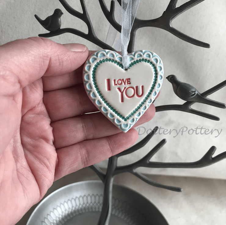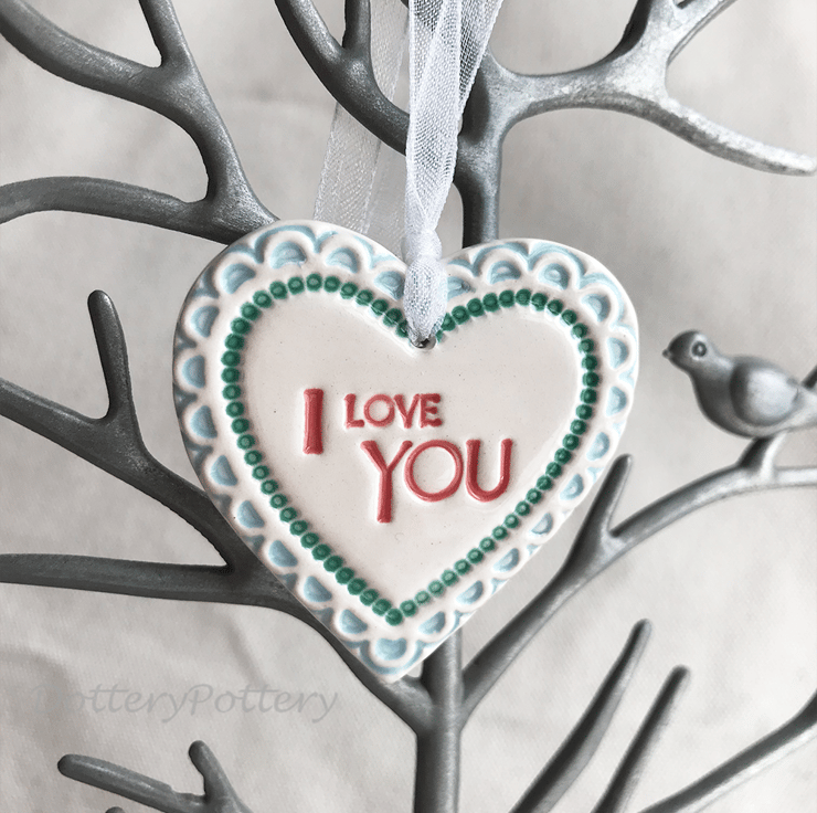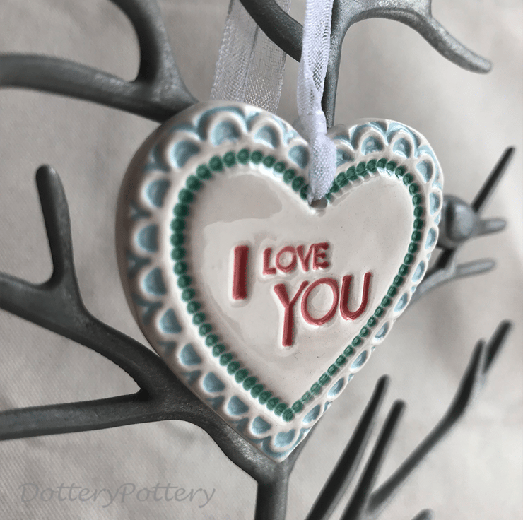 This little heart is made from white earthenware clay, imprinted with the words I Love You. It has been fired twice, once to the bisque stage and then a second firing for the clear glaze. It measures 4.5 centimetres wide x 5cm height x 5mm thick. It can be hung outside.