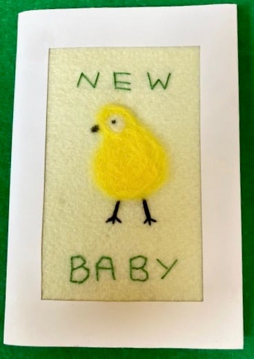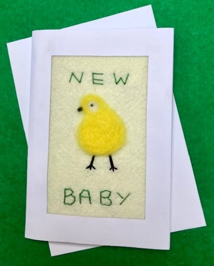 This delightful, furry chick has been needle felted with wool onto a piece of white felt. The chick has then been mounted in a white aperture greeting card 4" x 6". The card comes with a matching white envelope & has been left blank inside for your own message.