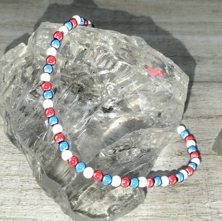 This stunning anklet is 24cm long thread onto elastic using 4mm red, white and blue miracle beads .