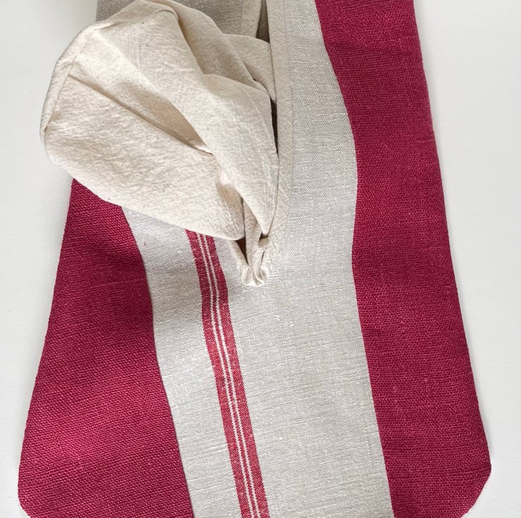 I made the patchwork front using unbleached vintage linen with a red stripe, plus some lovely red linen remnants. The full bagged-out lining and back are unbleached cotton. It's strong! The unbleached linen tapes are 2m long.