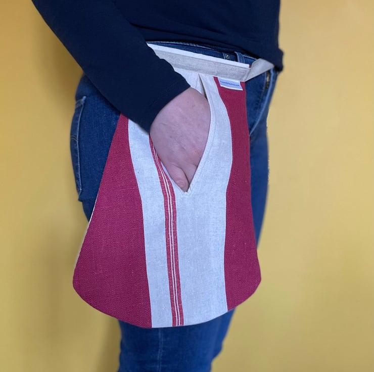 I love using remnants and recycled fabric to make patchwork fronts for my pockets. This one is made using part of a (huge!) vintage linen tea towel with narrow red stripes, and some scraps of beautiful floppy red linen from a historical costumier's leftovers bin.