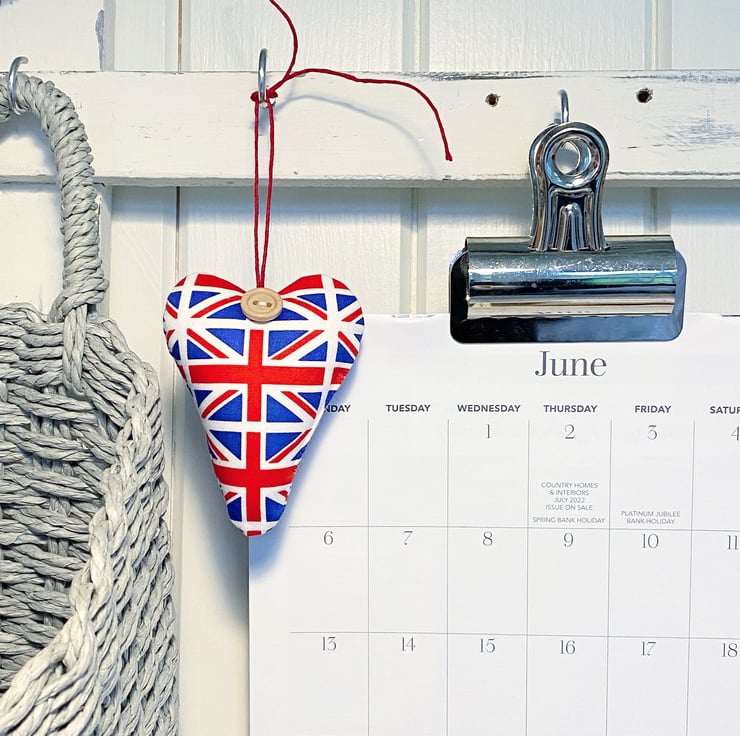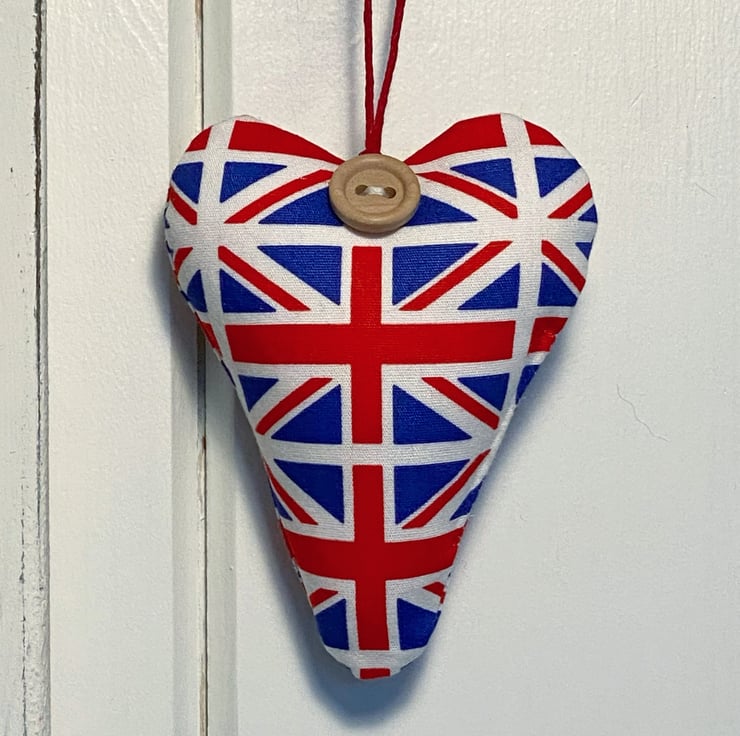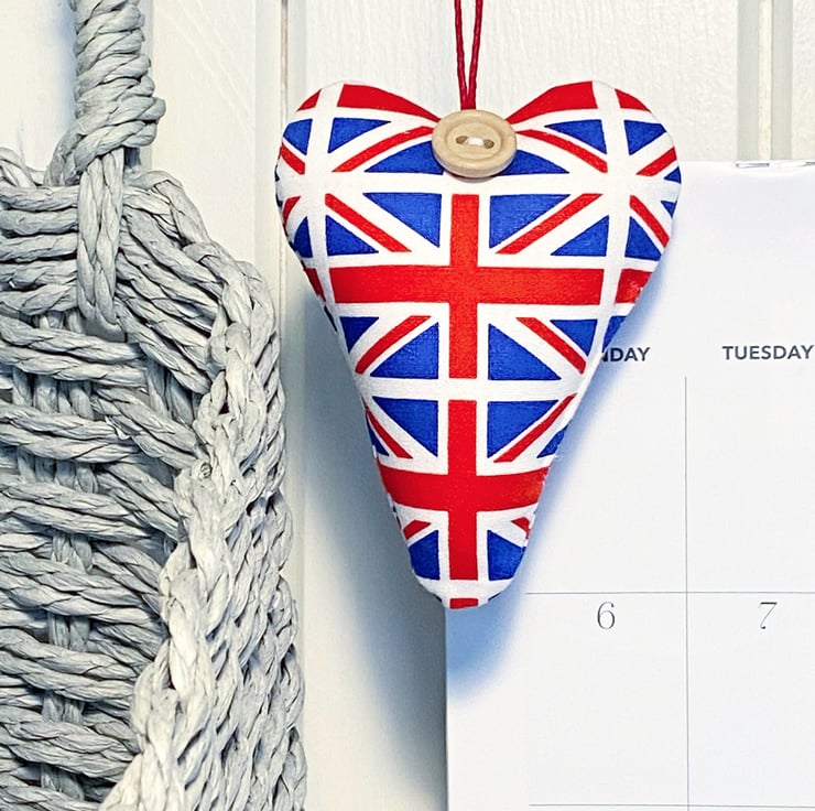 This patriotic decorative heart, in smooth Union Flag printed cotton, is plumply padded with toy-grade stuffing or generously filled with locally grown Hampshire lavender and is hand finished with a round wooden button and red hemp twine hanging ties.