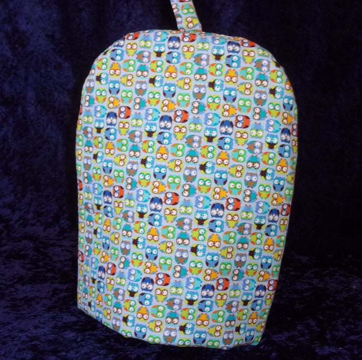 The design features small owls in blue, green, yellow, brown and orange on a pale blue background.