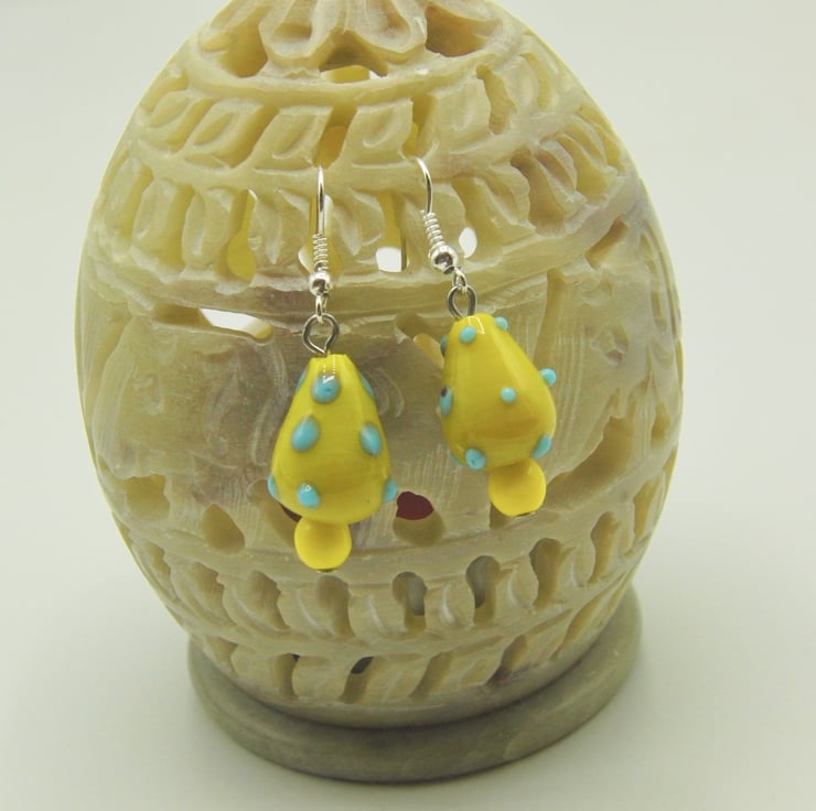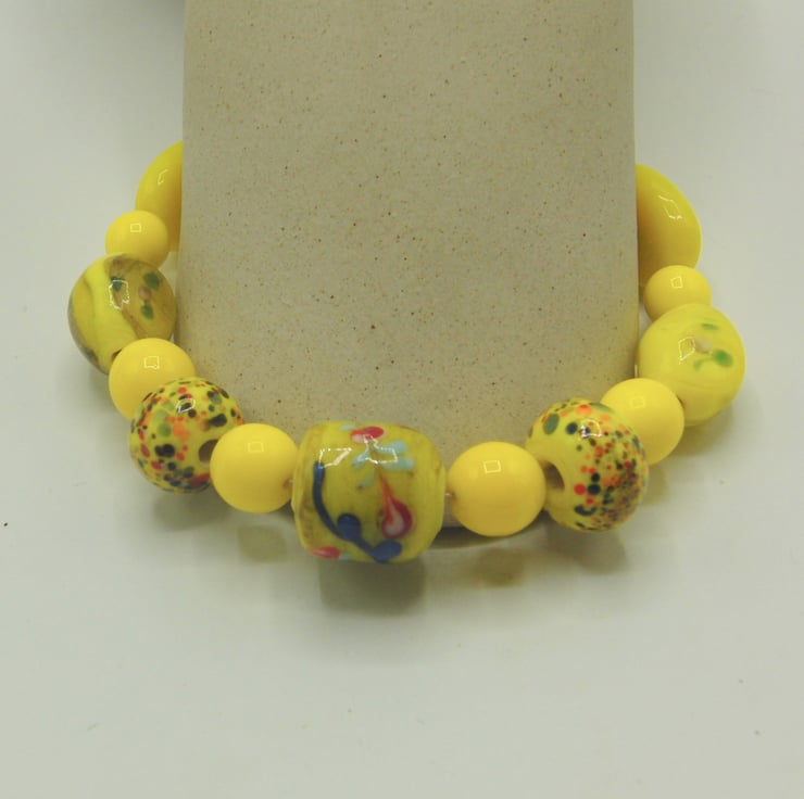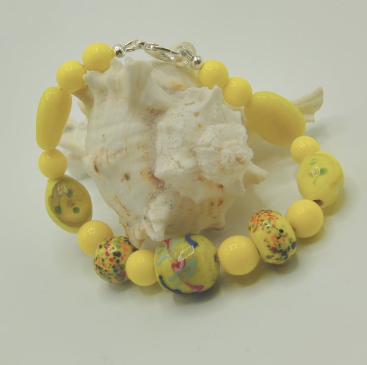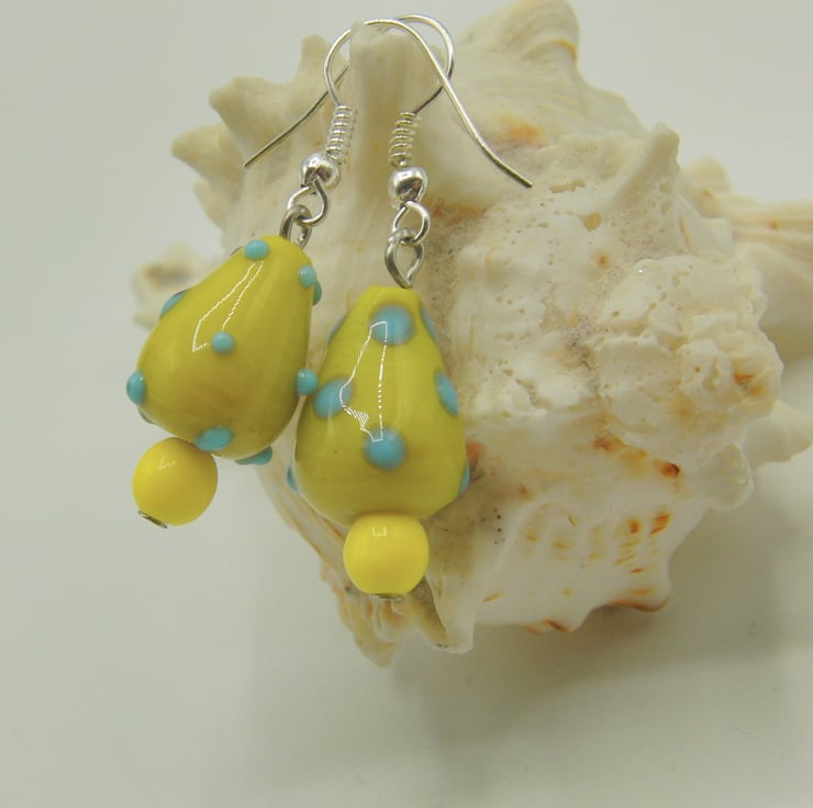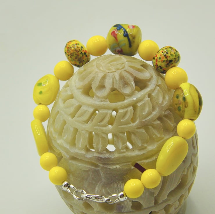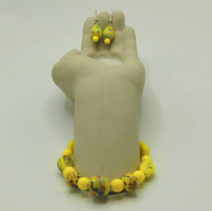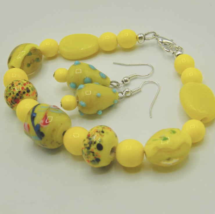 This stunning bright yellow bracelet and earrings would go well with any outfit that you wear for a daytime party or evening out. It would also make a lovely gift for a friend or relative for a birthday or anniversary, or a lovely treat for yourself. The bracelet is made using a mix of yellow beads with sizes ranging from 6 mm up to 15 mm x 15 mm. The beads are an assortment of glass beads and very pretty lampwork beads. The bracelet measures 20.5 cm (8 inches) long and it has a silver plated lobster clasp. The earrings are made using a 18 mm x 15 mm yellow tear drop beads with blue spots and a plain yellow 6 mm bead. They are hung on silver plated ear wires. The bracelet and earrings will be dispatched wrapped in tissue paper in a pretty organza bag and delivered to you via Royal Mail first class post.