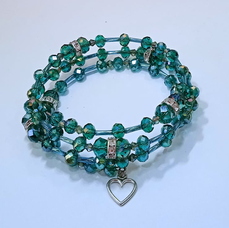 This lovely bracelet is made from memory wire strung with green crystal beads interspersed with decorative diamante and glass tube spacer beads. The bracelet is finished with a small silver plated heart charm.
