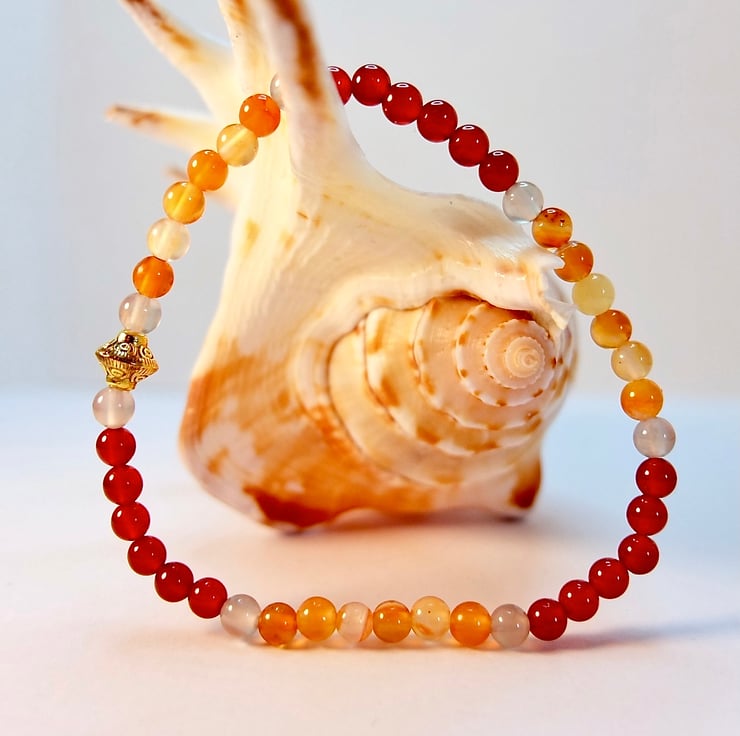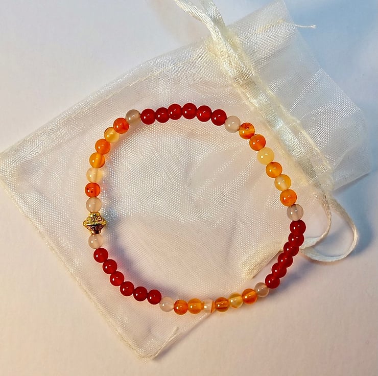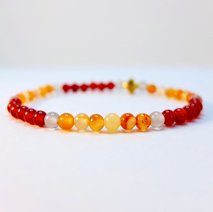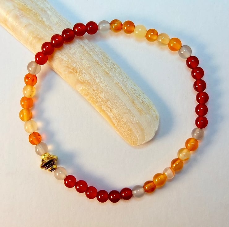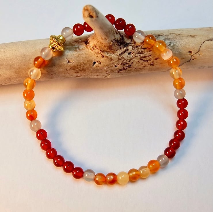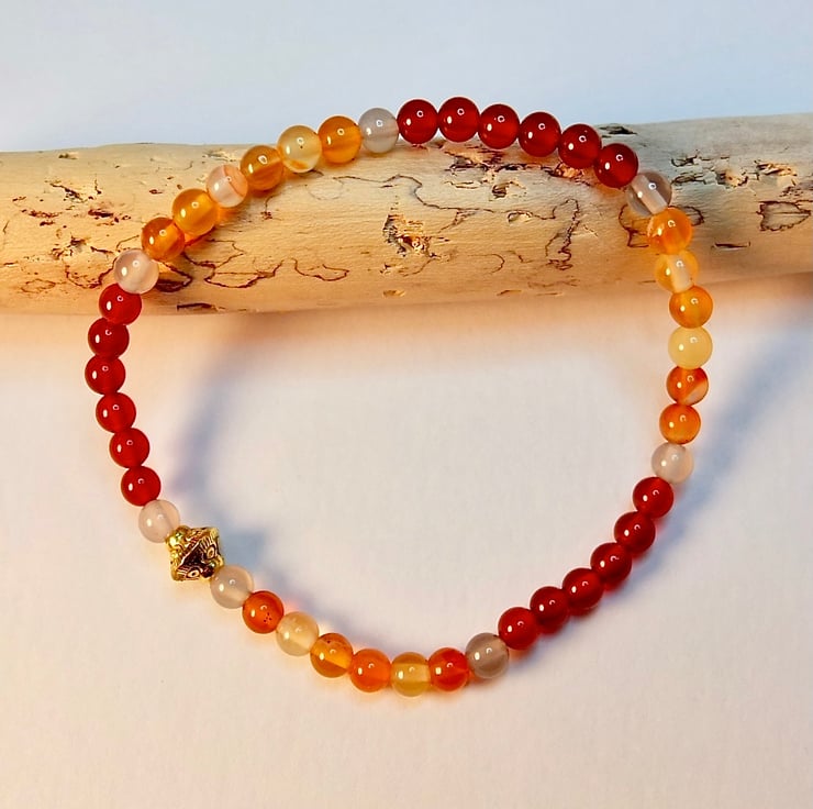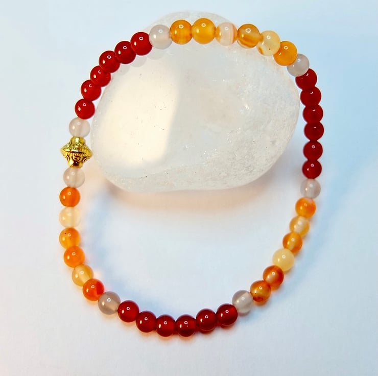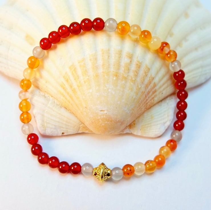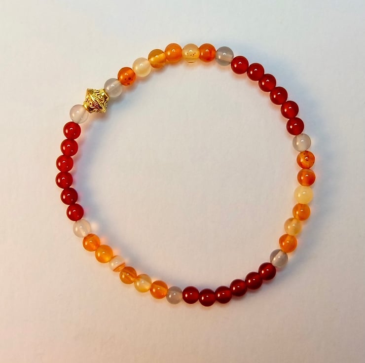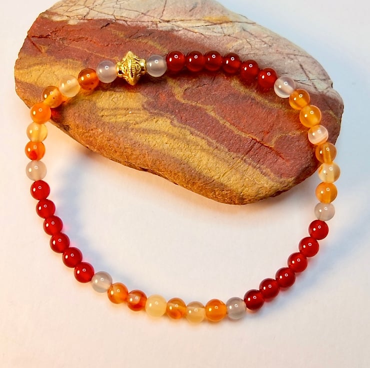 A dainty bracelet made from 4mm beads of dark orange-red and light amber coloured Carnelian beads separated with 4mm pale grey Agate and finished with a 7x6mm Tibetan-style gold spacer bead that is nickel and lead free.
