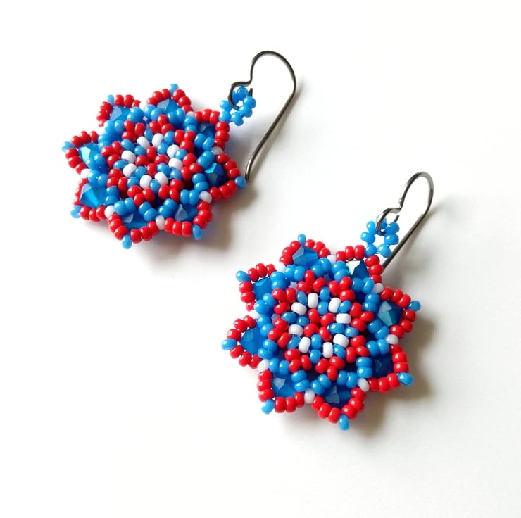 This pair features very pretty Preciosa 4mm crystal bicones in Capri blue - with a sparkly matte blue finish - plus seed beads in red, white and blue. Perfect for holidays and summer days - I think they also have a nautical vibe to them!