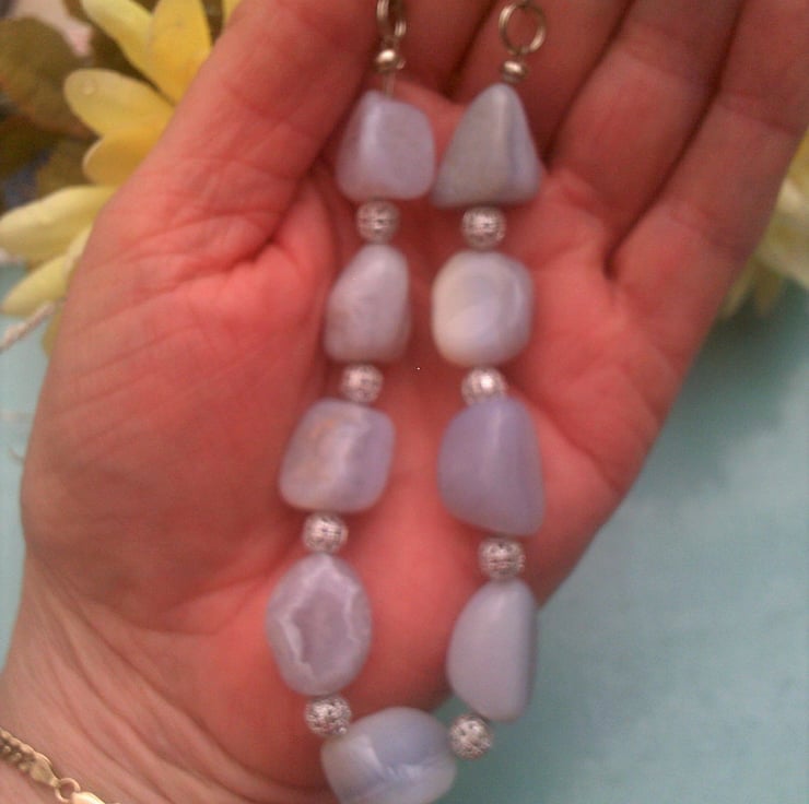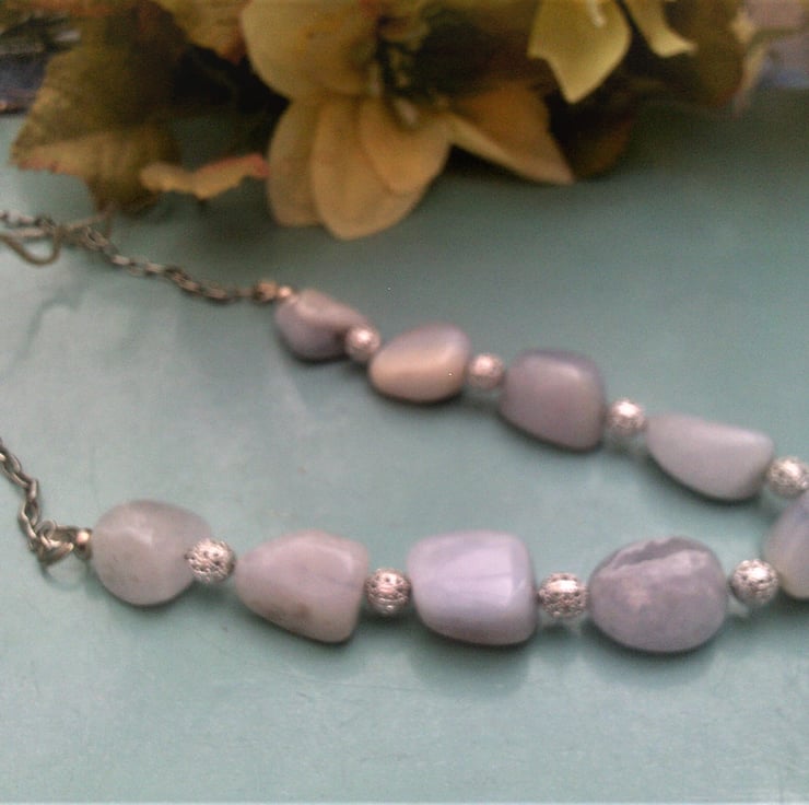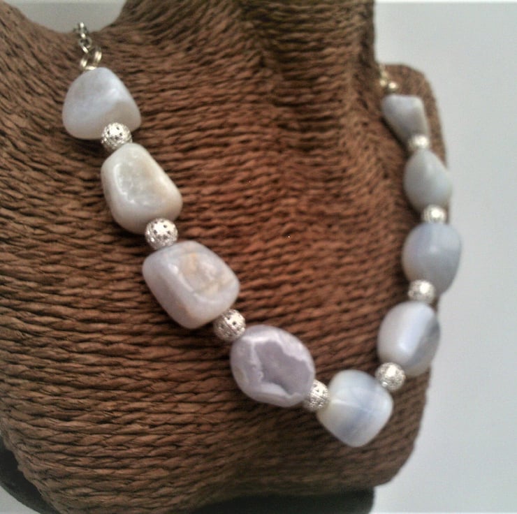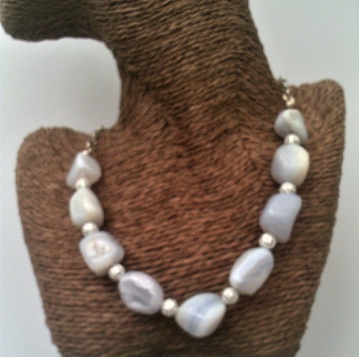 A blue lace agate nugget necklace with silver tone patterned beads and fastens with a lobster claw clasp, the chain is antique silver. The beautiful blue lace agate stones are a sky blue with some white striations in some beads, although everyone is unique, and are approx 20mm in size, and the chain has a 3 inch extender.