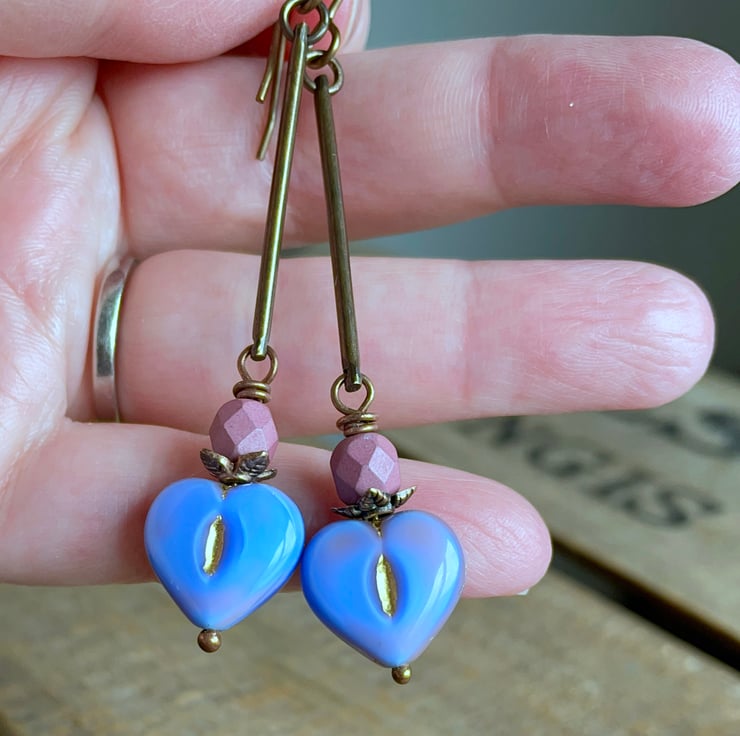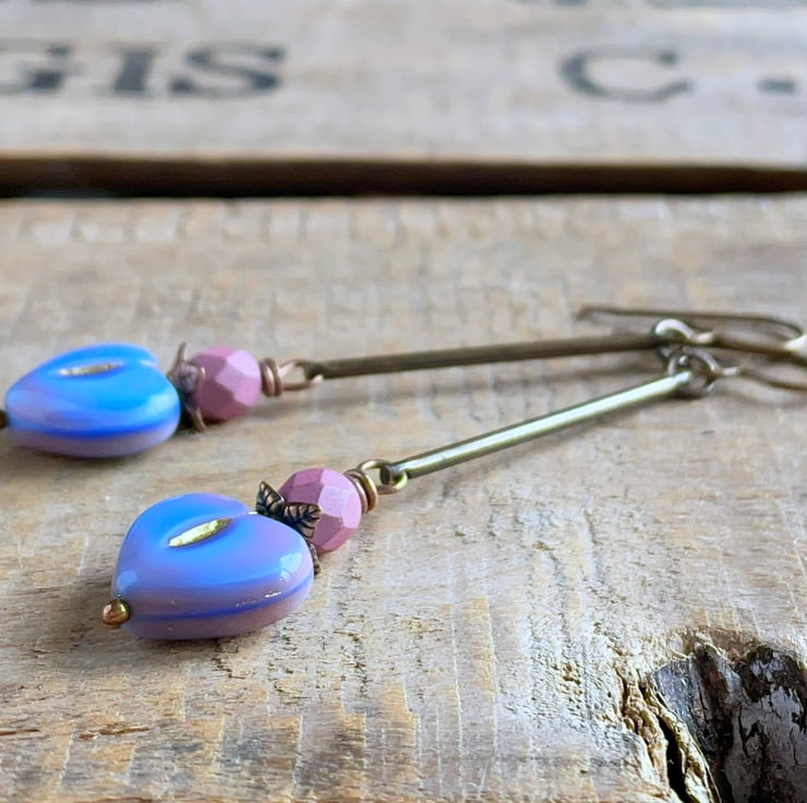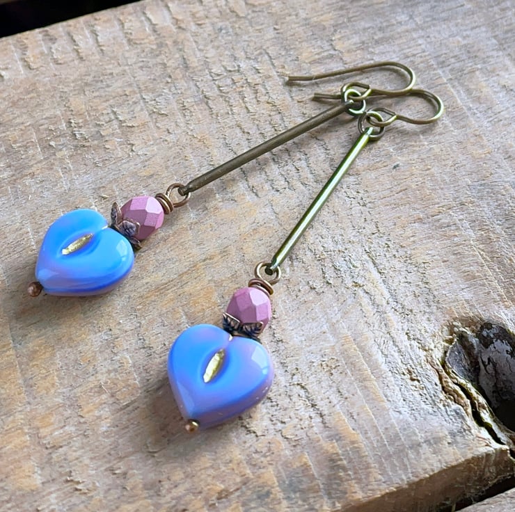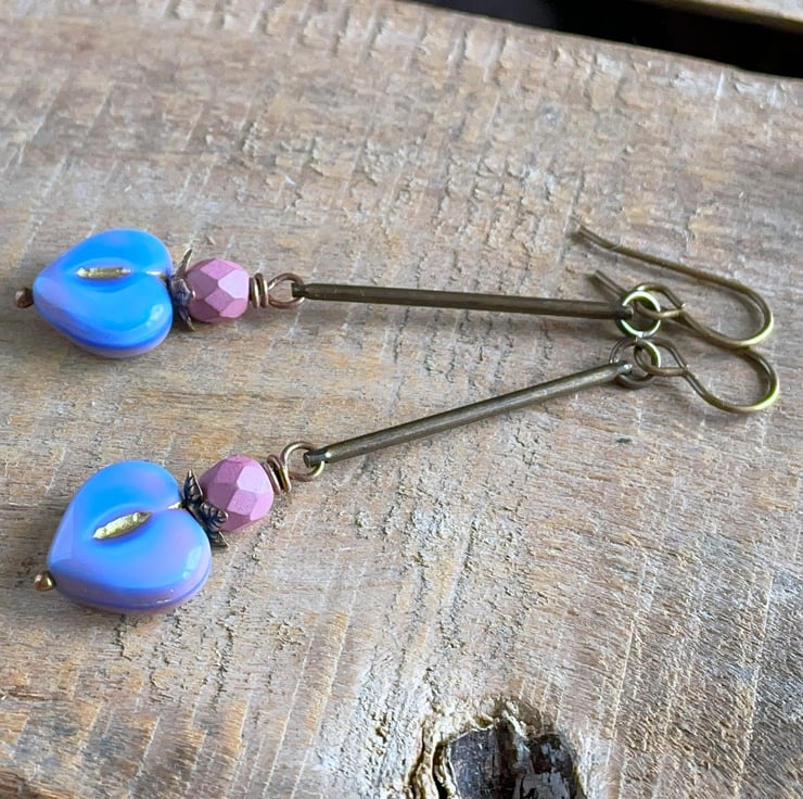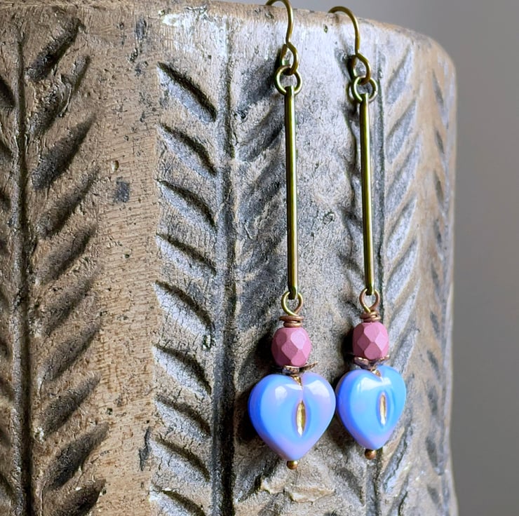 They feature heart-shaped Czech glass beads, in a beautiful shade of periwinkle blue with delicate pink and gold accents. They are mounted on copper ball headpins, with vibrant pink Czech glass fire-polished beads above.