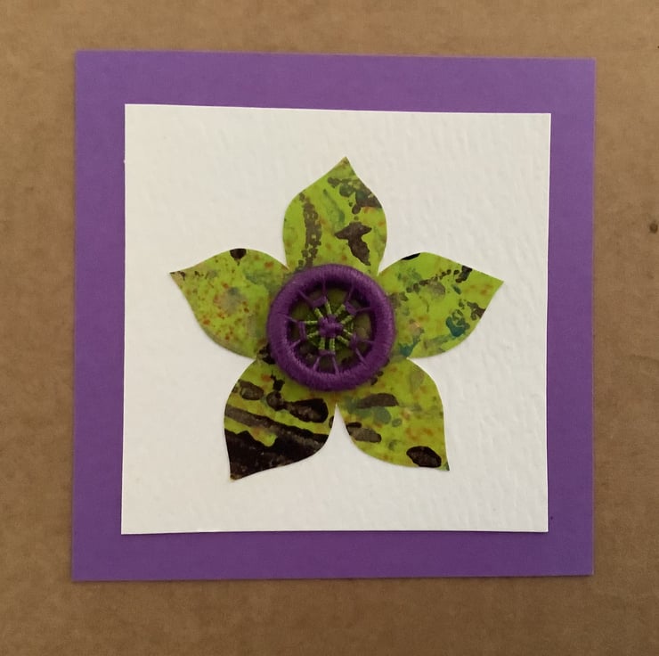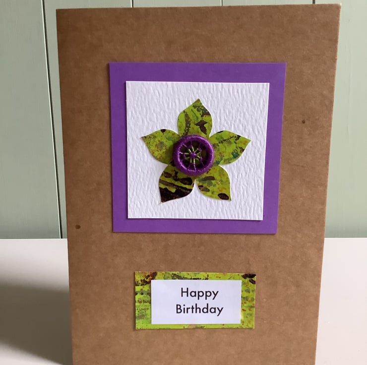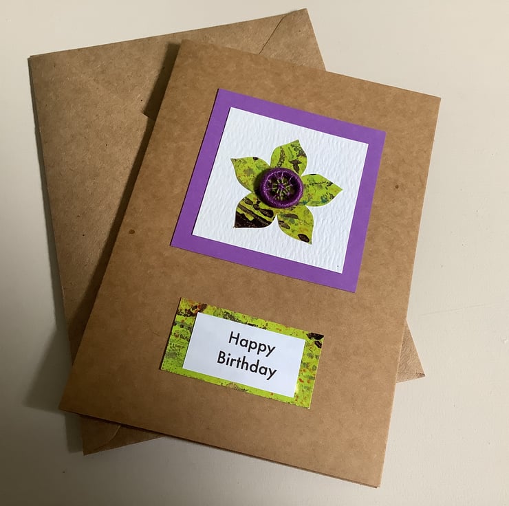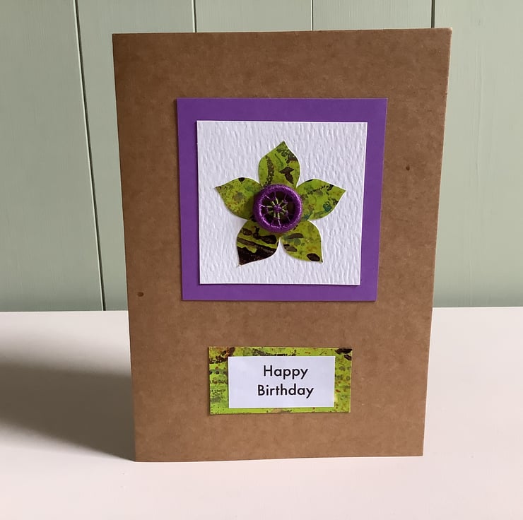 Handmade birthday card which has been decorated in a floral design using hand painted papers and a Dorset button. Ideal for anyone, but especially those with a love of craft.