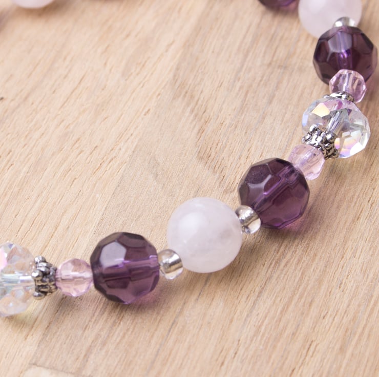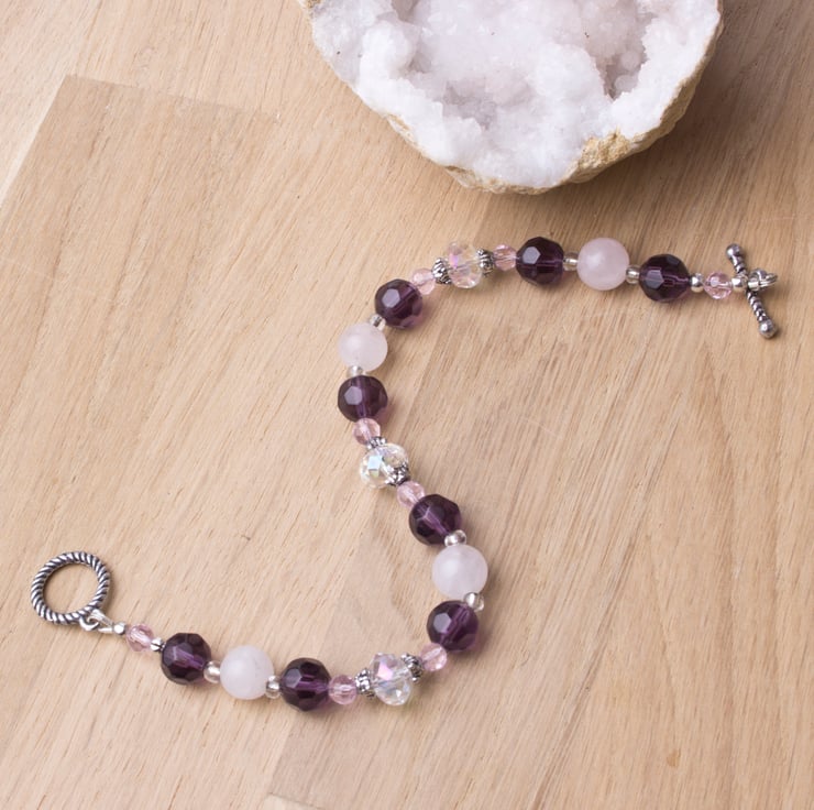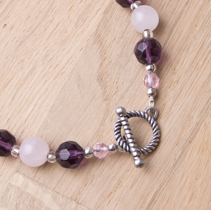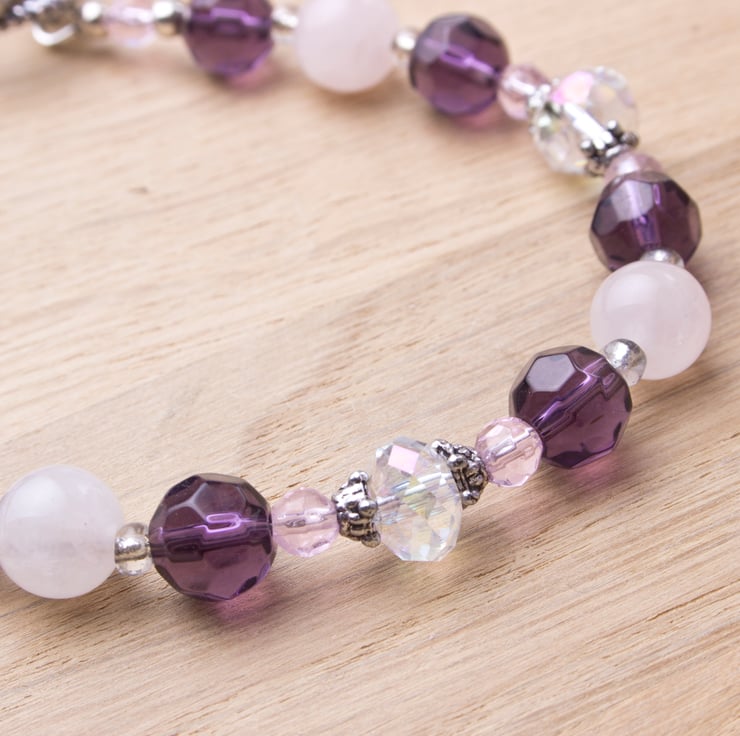 A pretty combination of rose quartz, purple faceted glass, pink faceted glass and crystal AB rondelle beads (twinkles in the light) with Tibetan silver fancy caps. Approximately 21 cms long with toggle clasp.