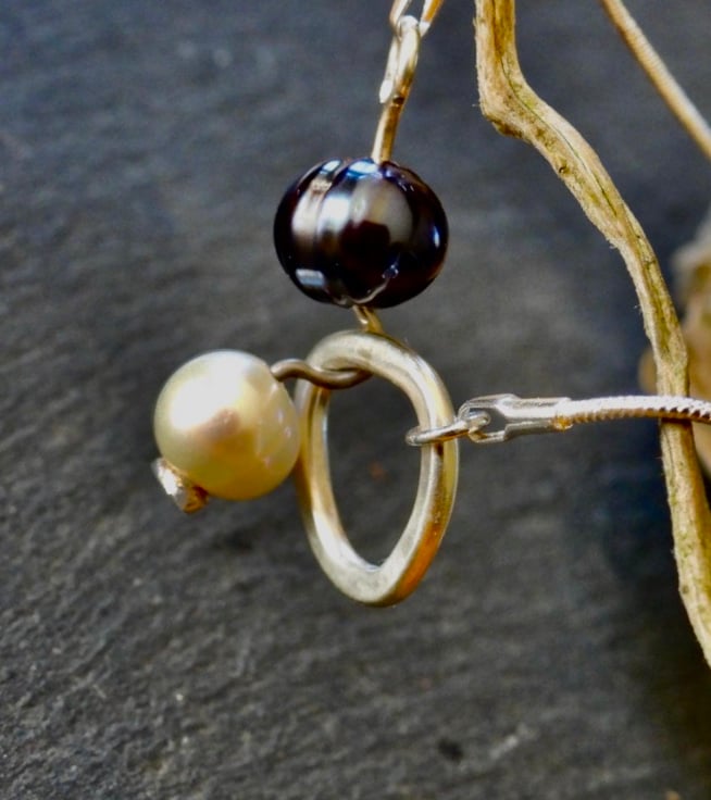 I love the contrast between the colours of the pearls, I particularly like the colour changes in the black pearl, iridescent shades of green and blue catching the light.