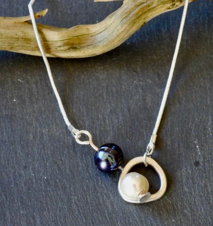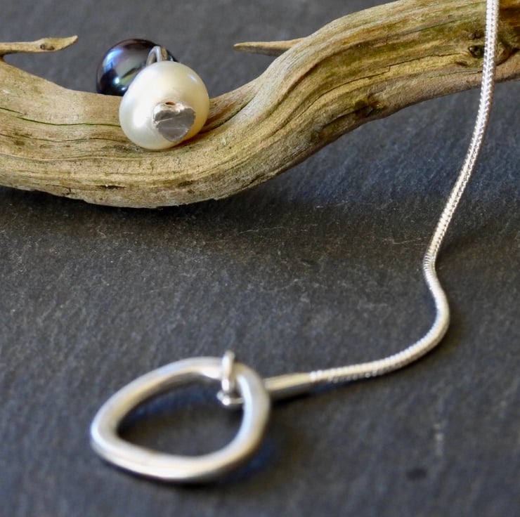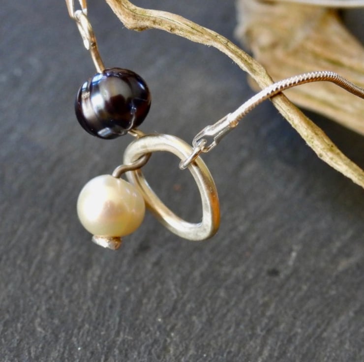 A sophisticated necklace, with a combination of white and black natural pearls. The slinky snake chain wraps around your neck and a silver link holds the pearls in place. The silver link is rough triangular shape hand beaten and formed to add to the unusual, unique,handmade appeal. It can be worn as a choker with the pearls hanging lower, or as a necklace with the link nestled between the pearls. At the end of the pearls is a heart shaped charm, subtle but an added intimate detail. Ideal for those evening events or just everyday. Fitted on an 18” (46cm) chain.