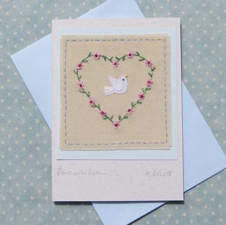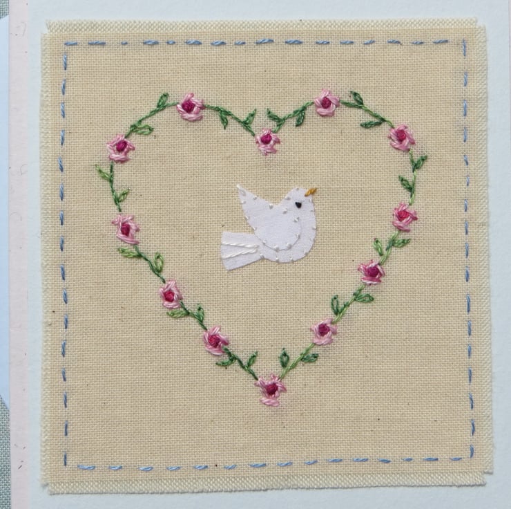 A hand-stitched miniature mounted onto greeting card, with title written beneath: Dove with Love. This carefully worked embroidered miniature is a gift in itself as well as a card in which to write your message - a card to keep. I have embroidered a heart shape of roses and leaves and added a tiny dove in the centre. Delicate and precious-looking, perfect for any special time.