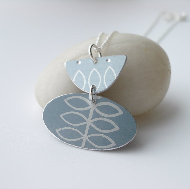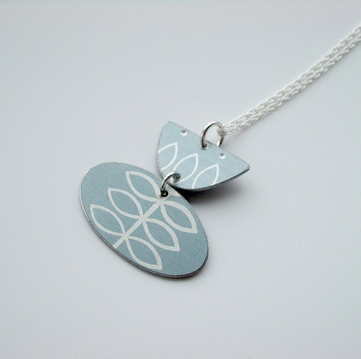 This tulip shaped pendant is made from aluminium which I have dyed in a light grey and printed with a silver leaf pattern. The dye is made permanent by sealing it in to the aluminium. I saw pierce the shapes by hand using a piercing saw and file the edges to give a nice smooth finish. I have also drilled partly in to the metal to reveal the sparkly aluminium underneath the dye.