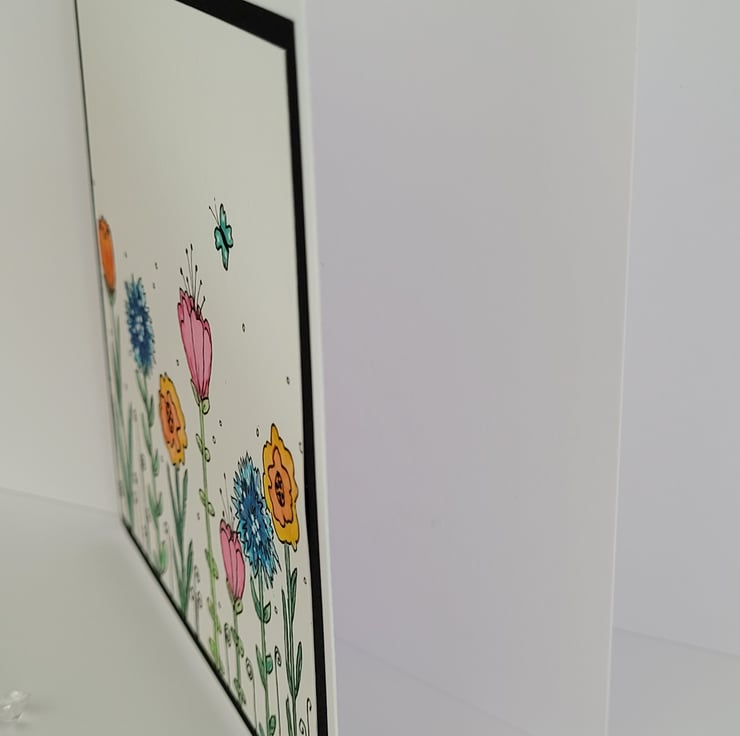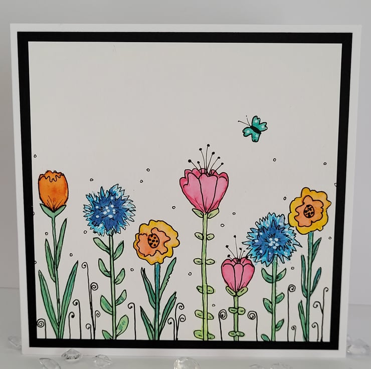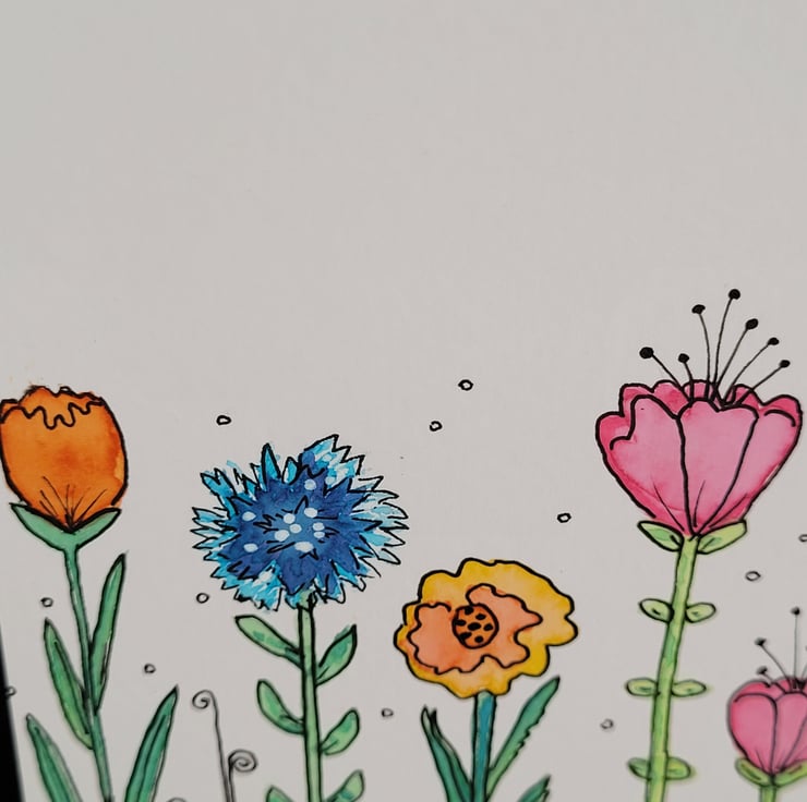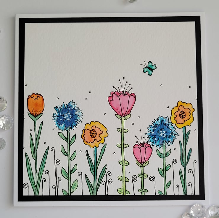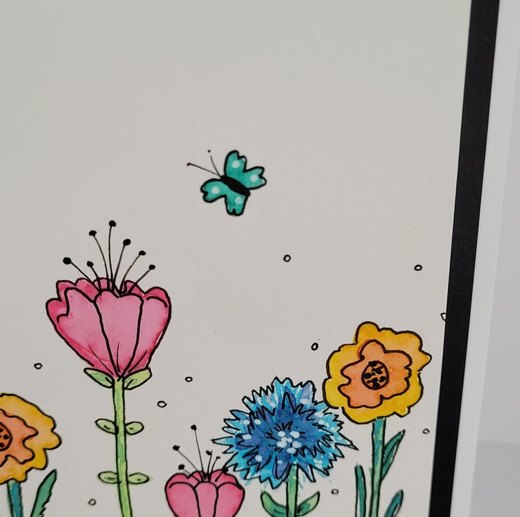 I painted the flowers in watercolours in mixed colours and when dry, I outlined them with a black waterproof fineliner pen. I added black details and a tiny butterfly.