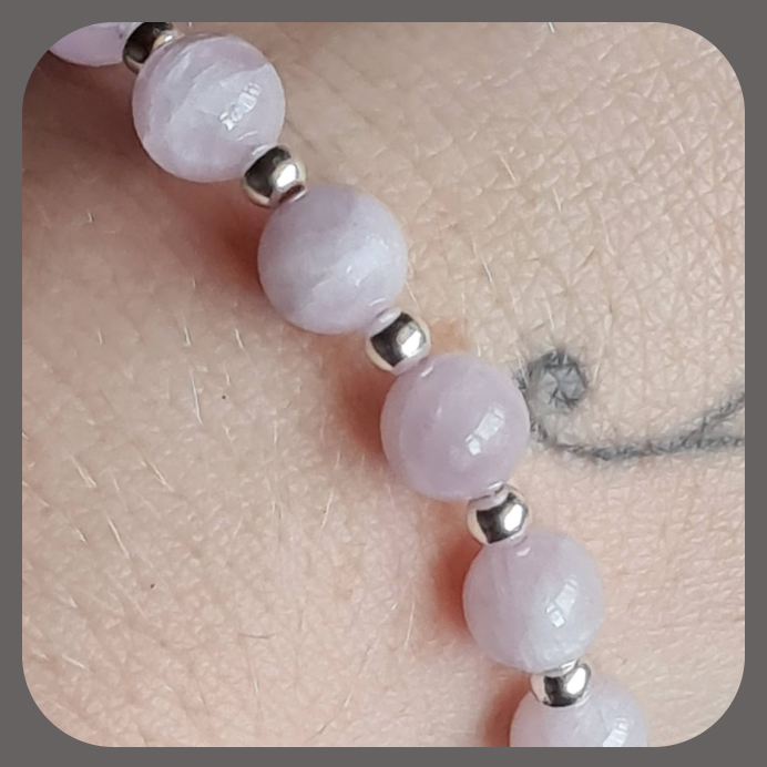 The Kunzite beads are about 6mm and the silver beads are 3mm. The bracelet measures approximately 6.75 inches. As it is elasticated, it is best to roll it on and not pull.