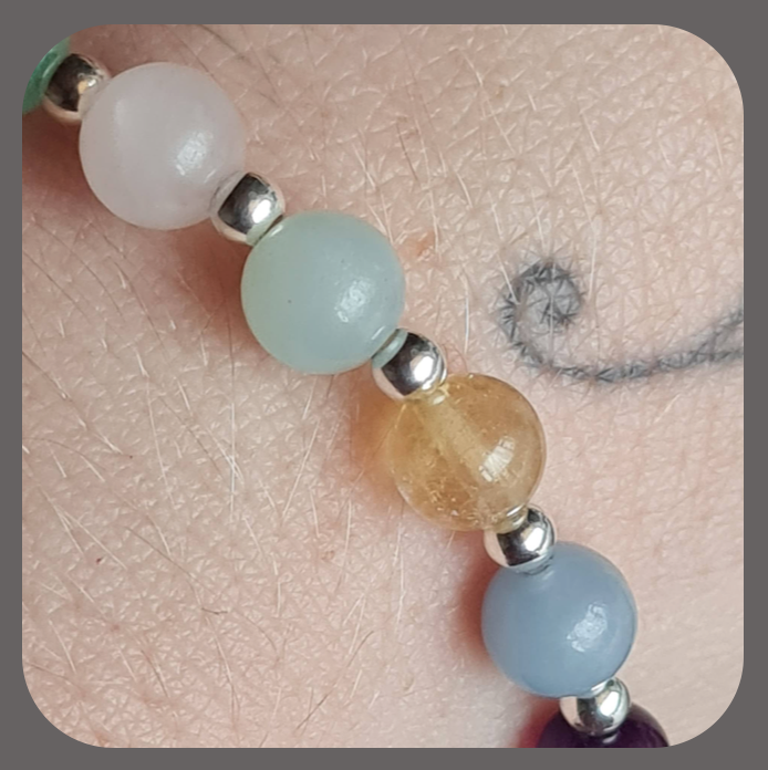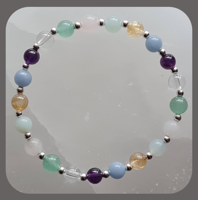 Elasticated, Amethyst, Rose Quartz, Angelite, Amazonite, Citrine, Clear Quartz and Green Aventurine with sterling silver beads.