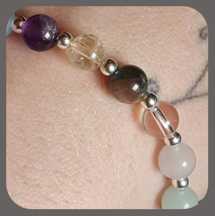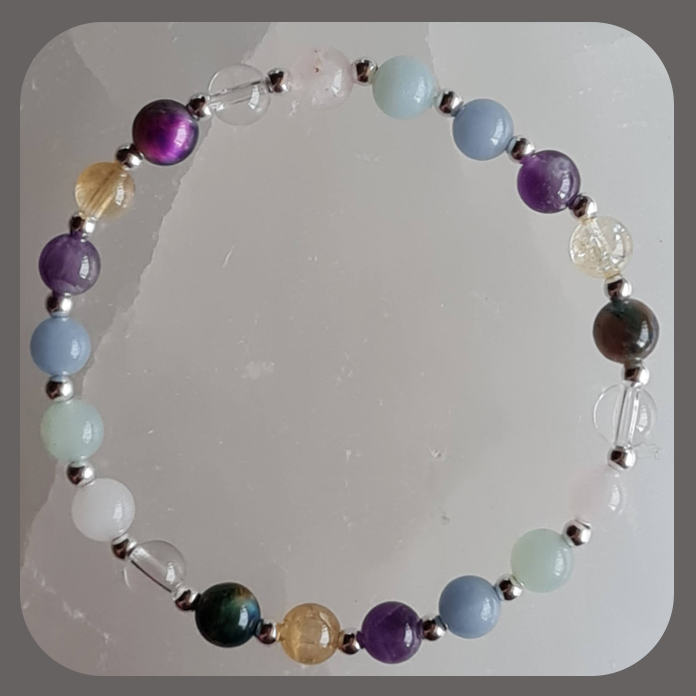 Elasticated, Amethyst, Rose Quartz, Angelite, Amazonite, Citrine, Clear Quartz and Tiger's Eye with sterling silver beads.