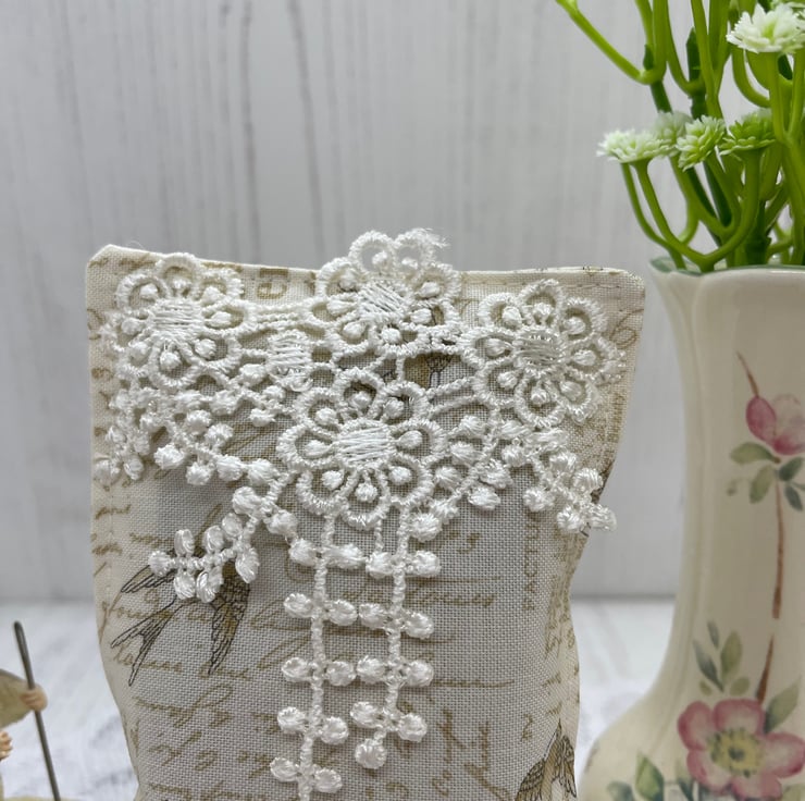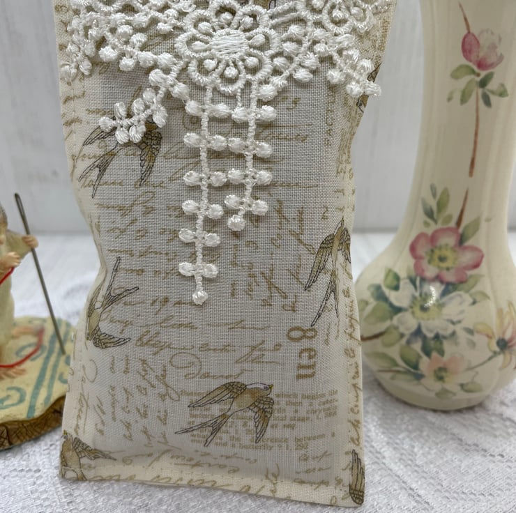 Nothing better than the delicious smell of Provence lavender. Swallow print cotton made into a lavender sachet and lace guipure
