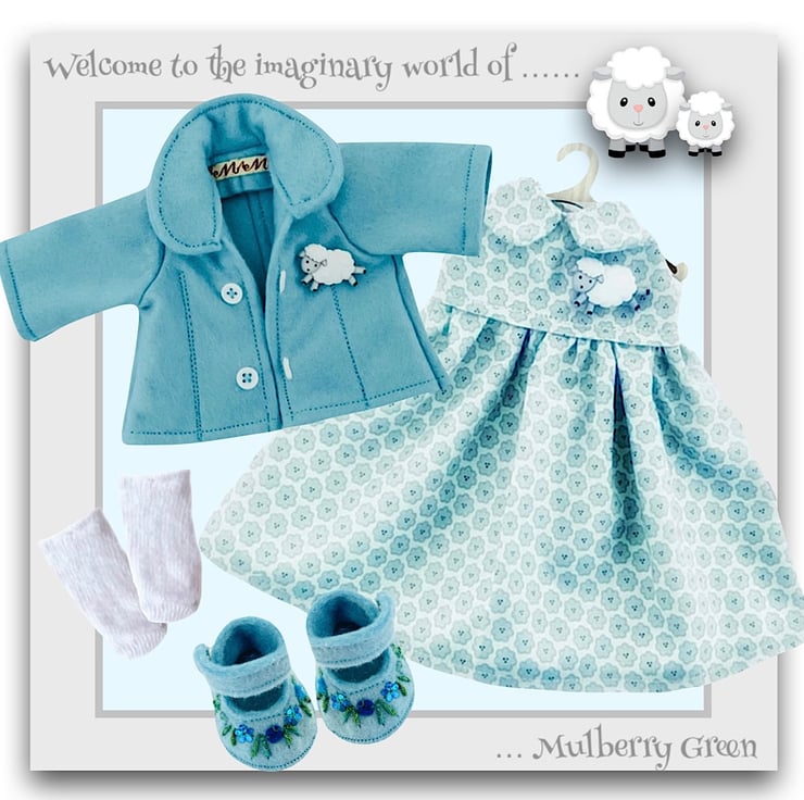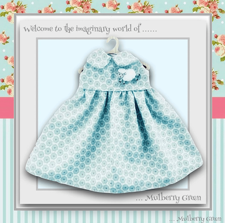 A really pretty little dress, with a Peter Pan collar, to fit the Mulberry Green characters. The dress is made from best quality cotton, has a full skirt and a lined bodice and is decorated with a cute little lamb.