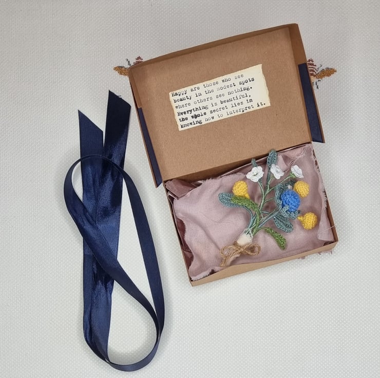 little wild flowers made ino a brooch , a mix of , thistle , babies breath, billy ball flowers, eucalyptus leafs