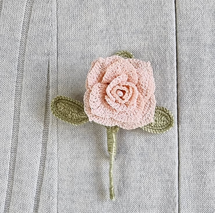 a pretty peach brooch made from cotton thread and lace wool, 12cm long ,