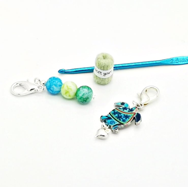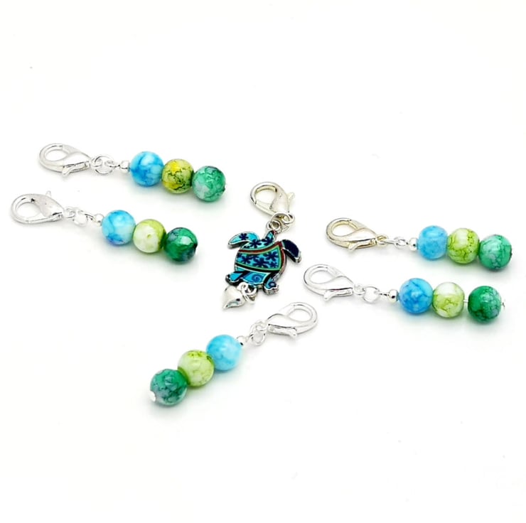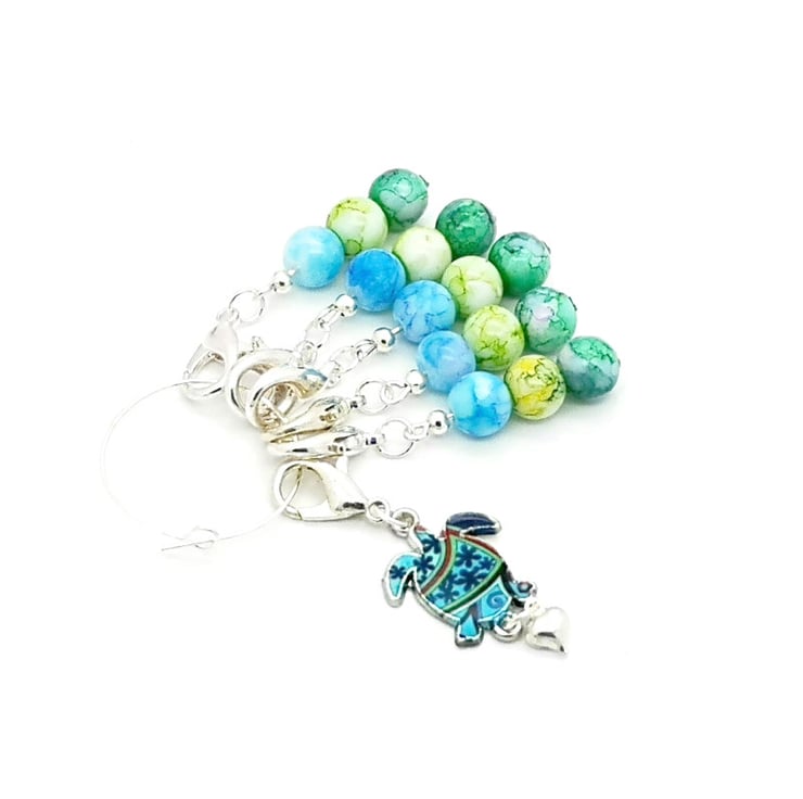 Blue, Green and Yellow mottled marbled beaded stitch markers, with an enamelled turtle. Perfect for all your knitting projects.