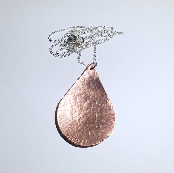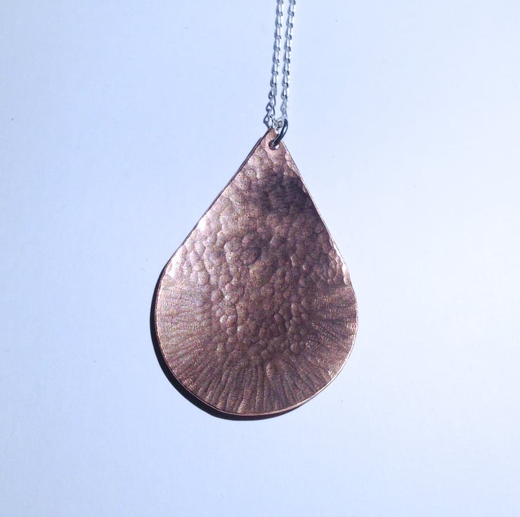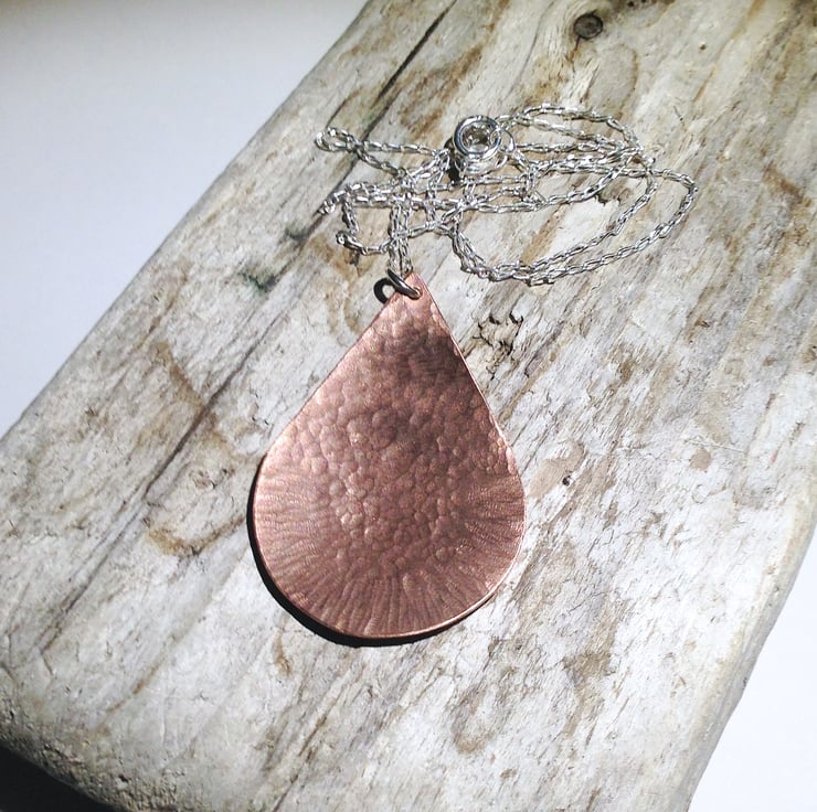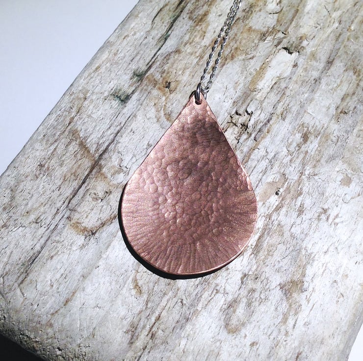 I have created this lovely pendant by hand sawing the shape from copper sheet before giving it an attractive hammered finish to create an interesting texture and shape..