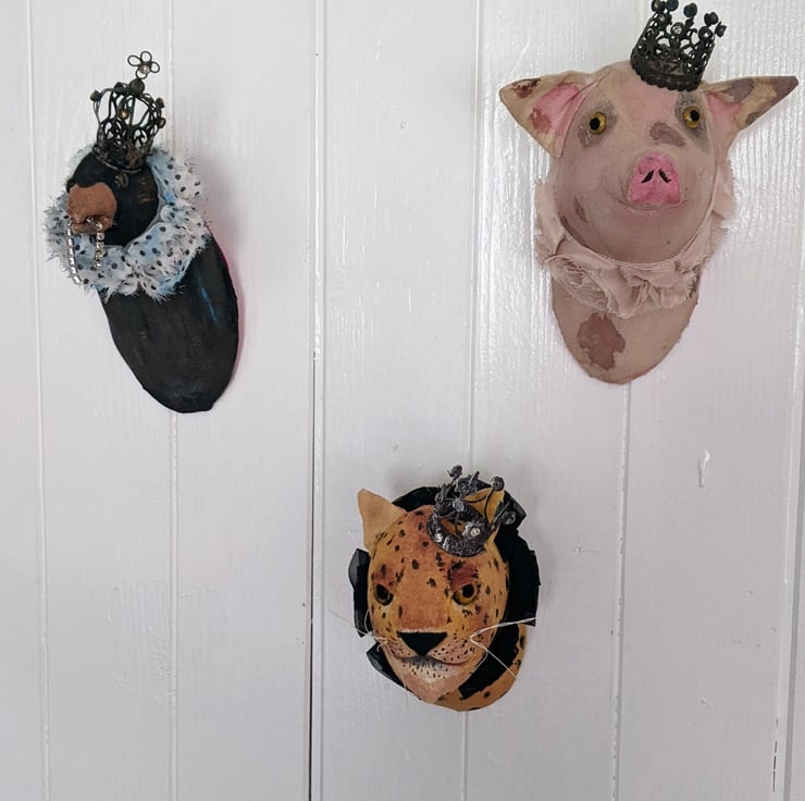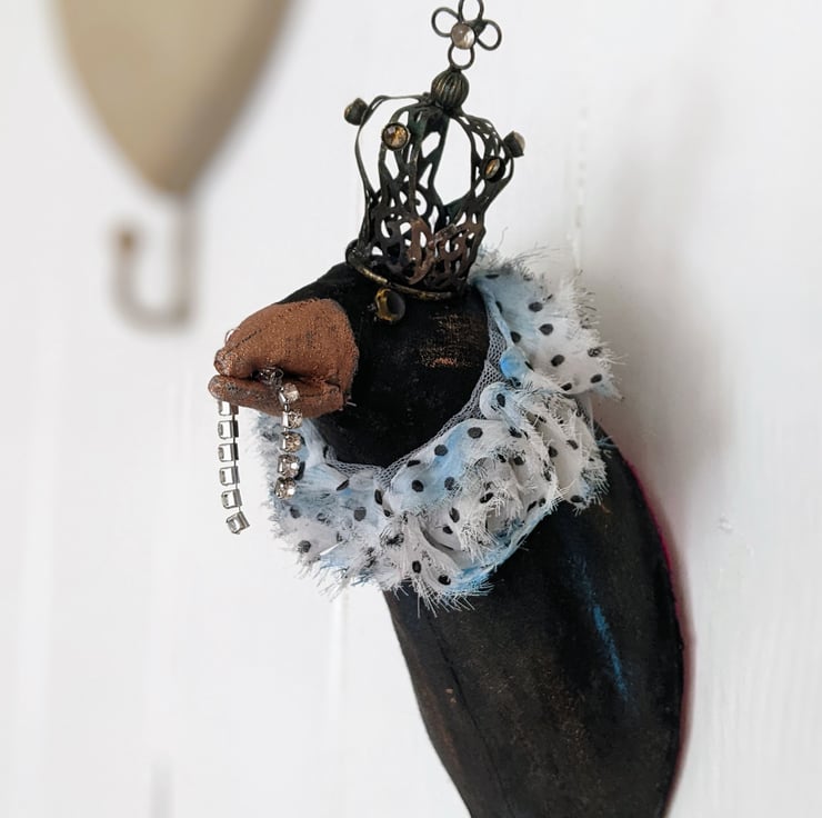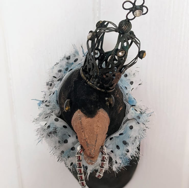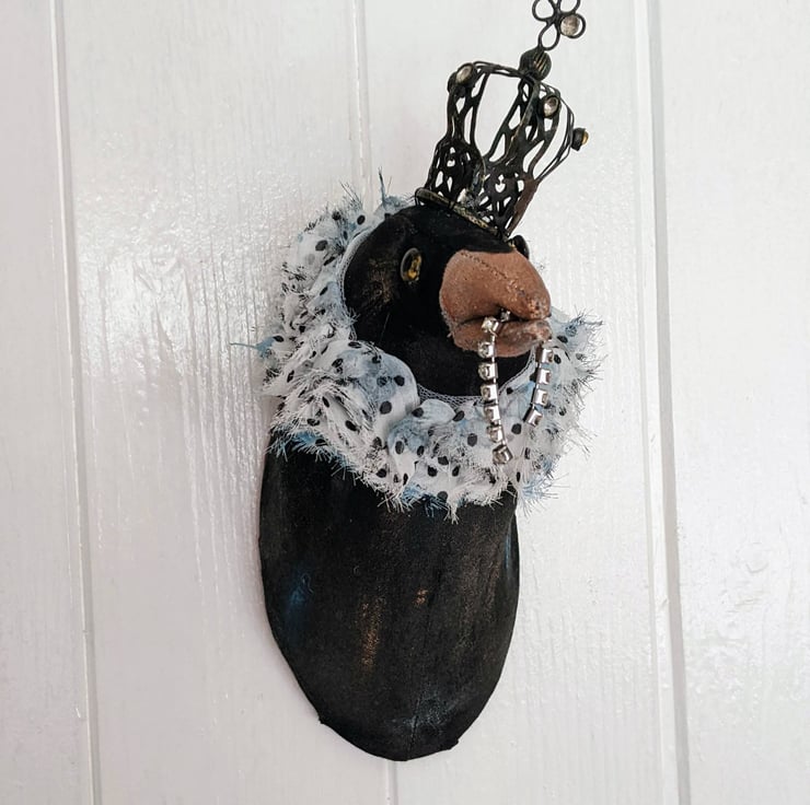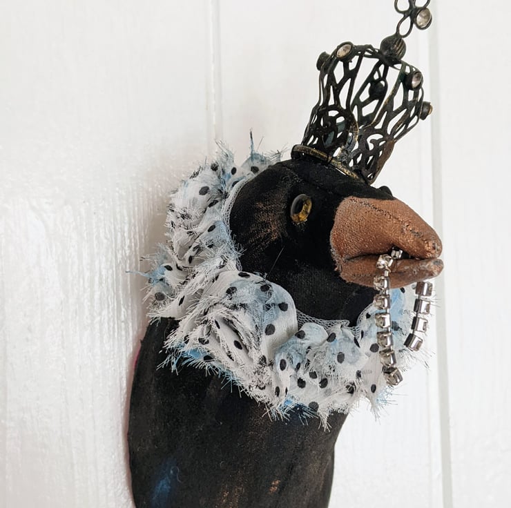 This piece ismade from unbleached cotton,and is hand and machine stitched as well as hand painted. On Ravens head is a metal crown inlaid with jewels and around his neck is a chiffon rose flower ruff with polka dots and because Raven is partial to a little glitter and shine, in his beak is a recently swiped rhinstone trim possibly from someones posh party frock. There is a metal D ring on the wood back for easy hanging.