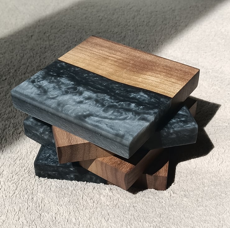 Beautiful solid Walnut wood and Grey resin coasters. 1 set of 4 coasters handmade with resin on one side and walnut wood on the other.