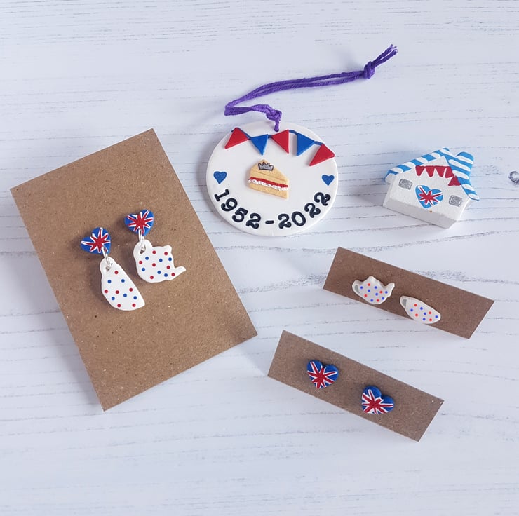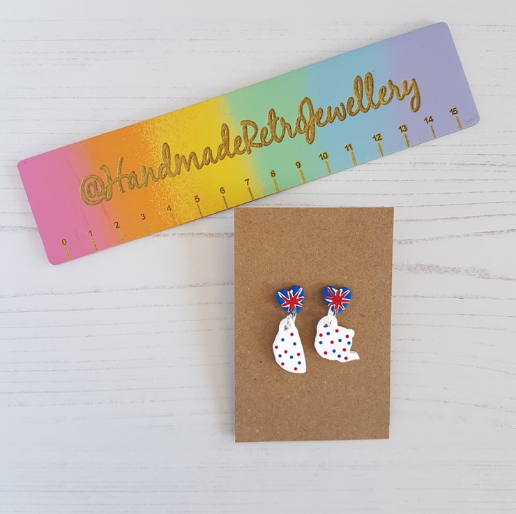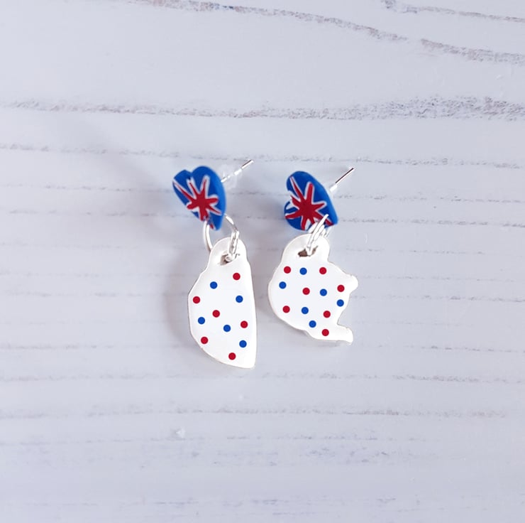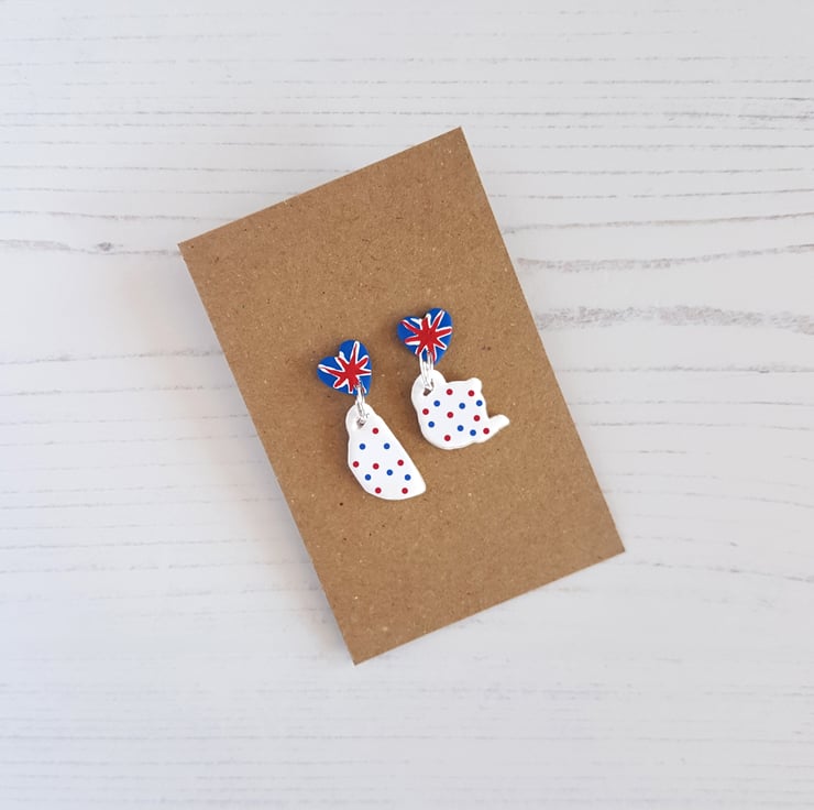 These bright and cute earrings have been carefully hand crafted using polymer clay - the top part with blue cut into a heart shape, with a Union Jack hand painted onto this using acrylic paint. The bottom part are matching white teapot and teacup pieces, decorated with red and blue polka dots!