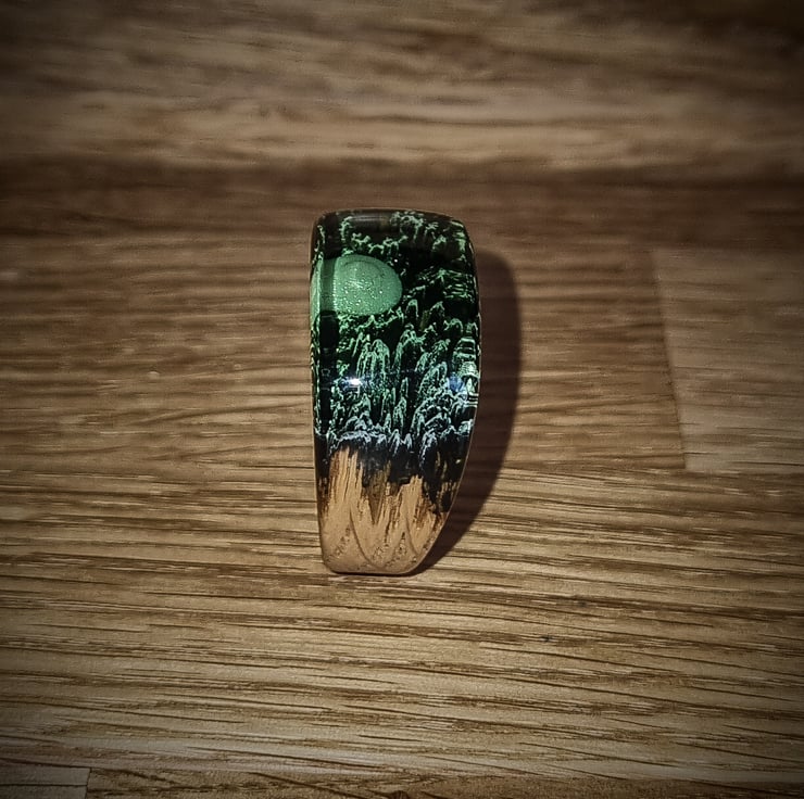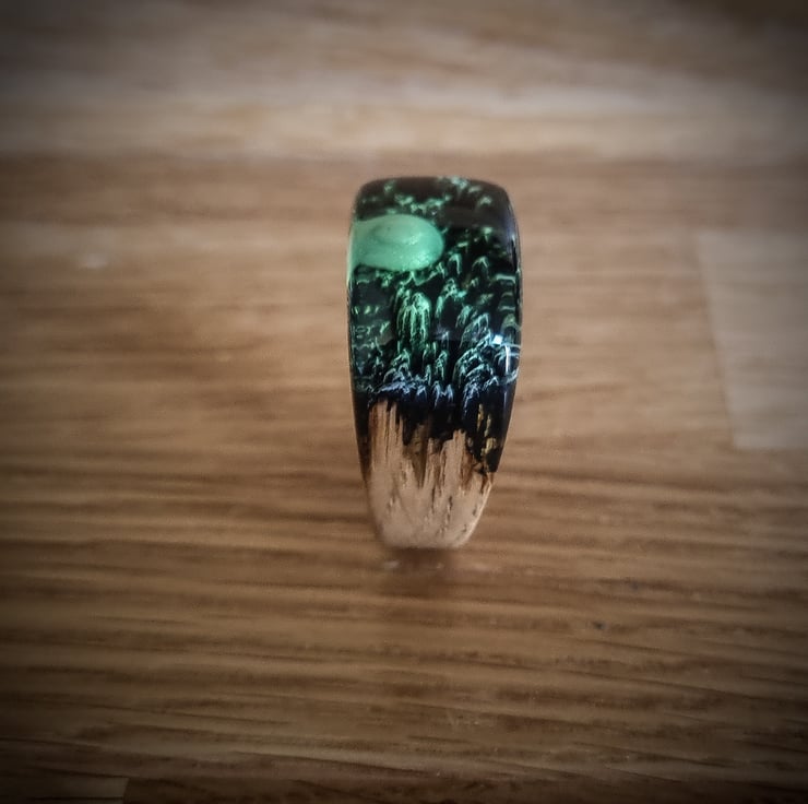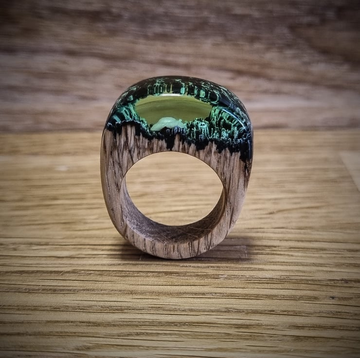 A stunning ring in Peridot with a crashed UFO on mountains.
