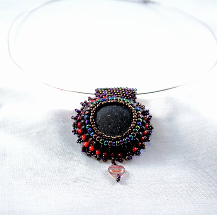 The pendant hangs by a broad loop of bead weaving from a sterling silver torc.