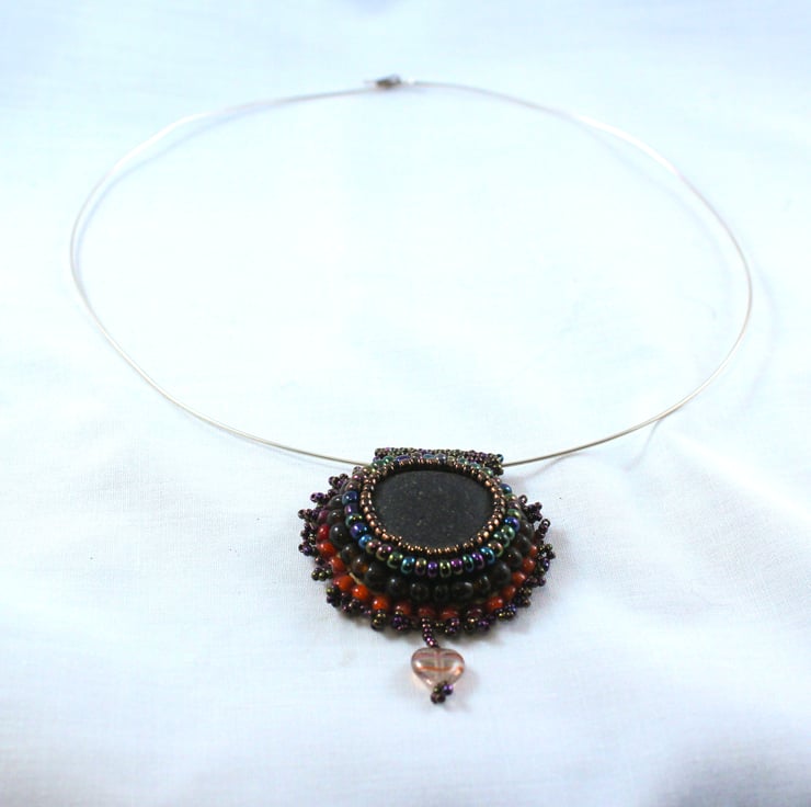 Lots of the beads in this pendant have a metallic lustre, rainbow colours with clear red and metallic bronze,and a row of bright orange-red beads.