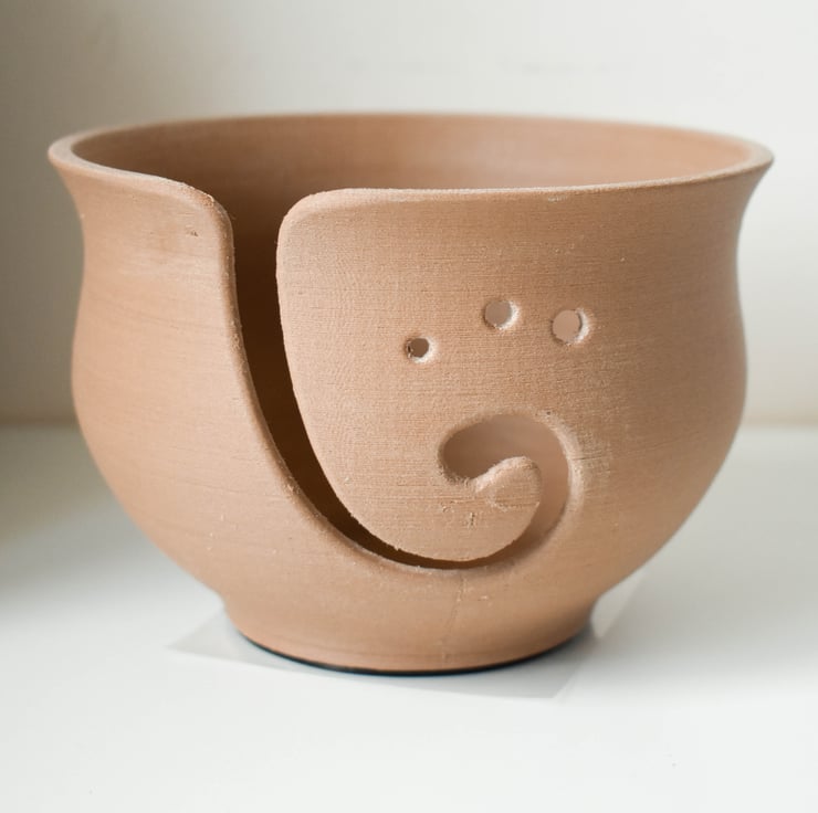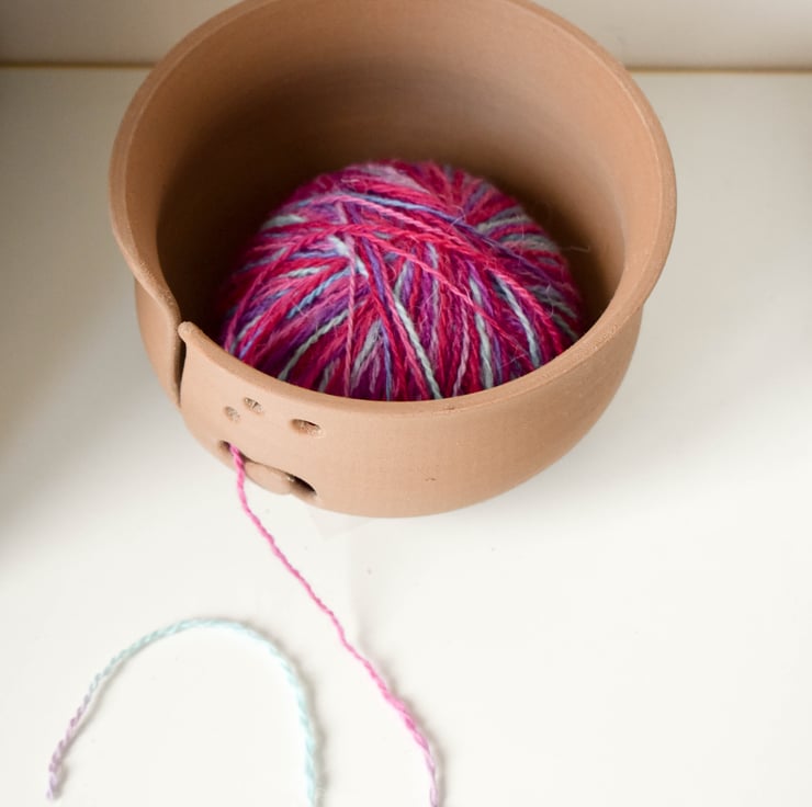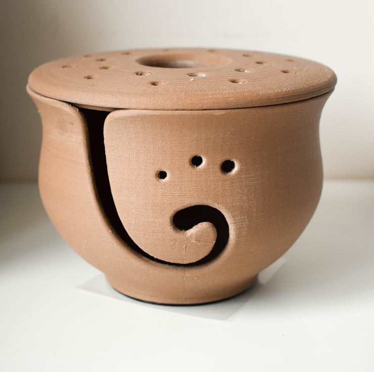 This yarn bowl has been 3D printed using PLA wood filament which is 30% wood fibre. This gives the look and feel of wood but allows for the creation of more complex shapes. The bowl is a terracotta brown in colour so would fit in with any living space or work room.