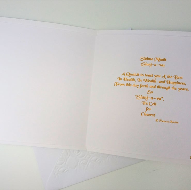 FRONT OF CARD: Greeting: Slainte Mhath - Slanj-a-va means CHEERS! Plus extra sentiment can be added.