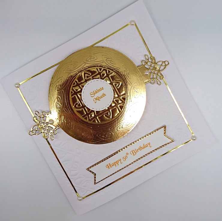 DESIGN: Top quality white card embossed with Celtic Braid design bordered in gold with pearl gems in each corner, The Quaich is in three layers, embossed with another Celtic design. The greeting is in the centre of the base and the two decorative handles are adorned with matching pearl gems.
