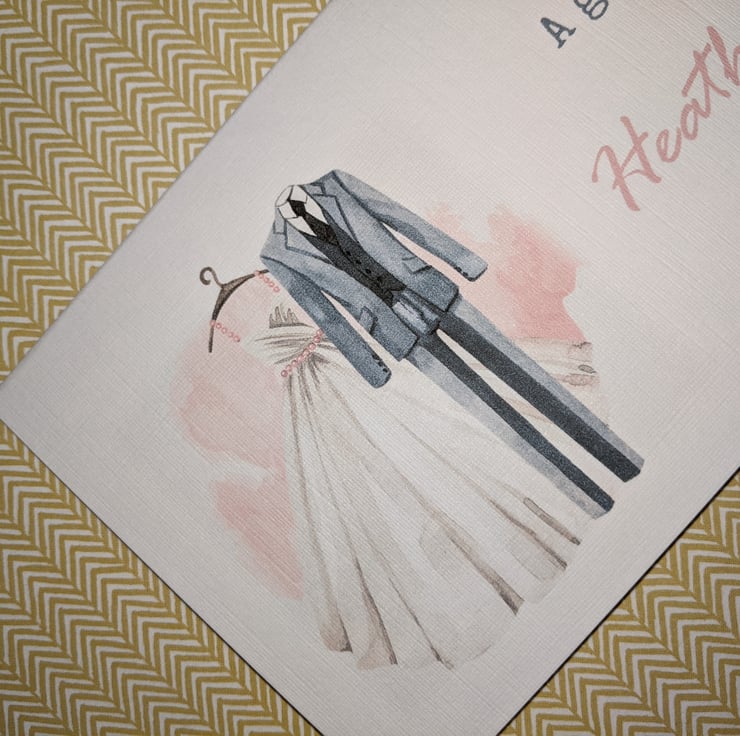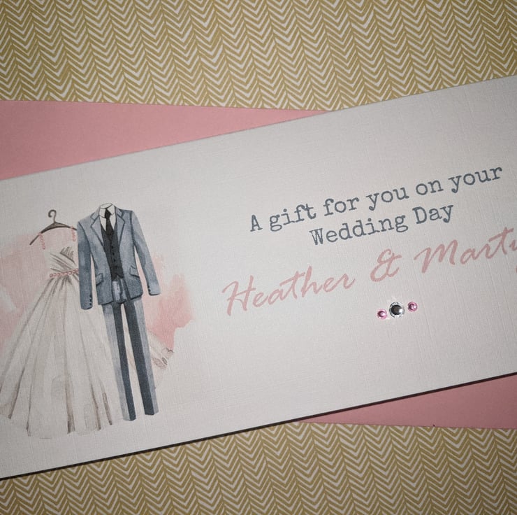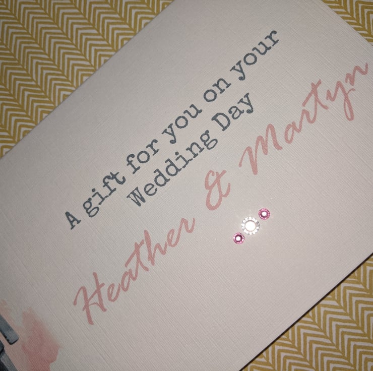 Is made from 255gsm white linen embossed card, printed with a pretty bride and groom image,and finished off with coordinating gem stones, and has a pocket inside printed with 'with love from.