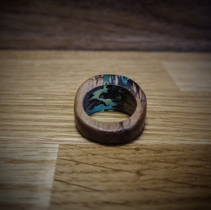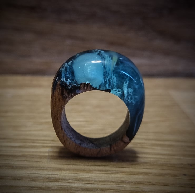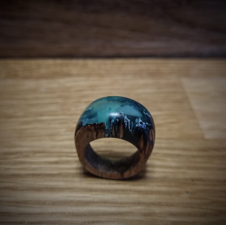 A lovely ring made from Oak and resin in Turquoise with a smoking UFO on a mountain!