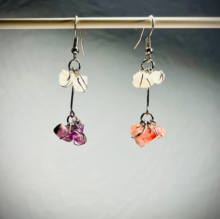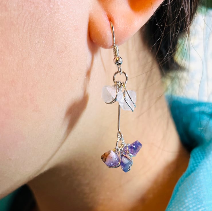 Earrings made with Clear Crystal Quartz, Amethyst ,Rose Quartz gems and Silver earring hooks