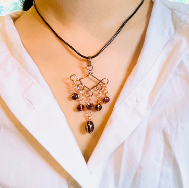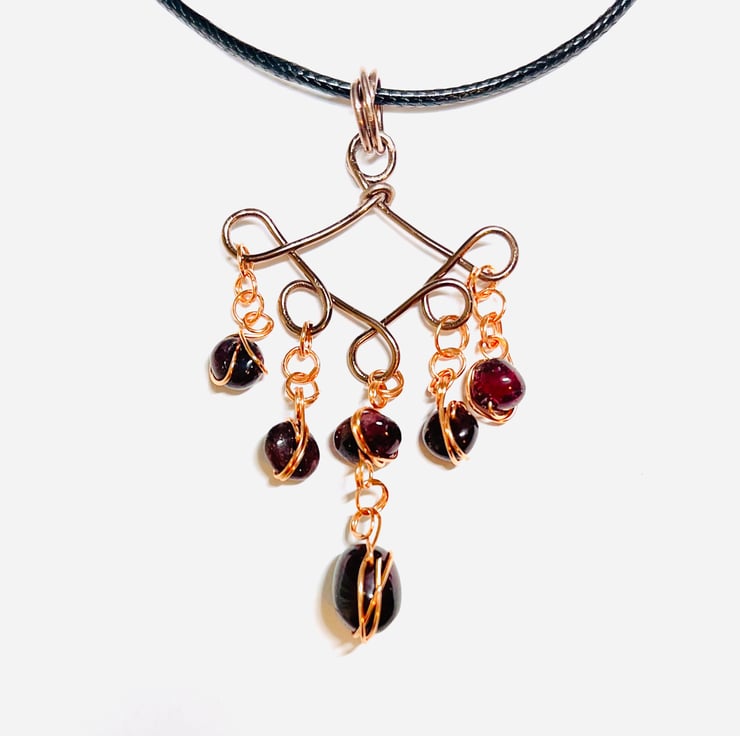 Pendant made with Red Garnet Balls and Brown Aluminum Wire.