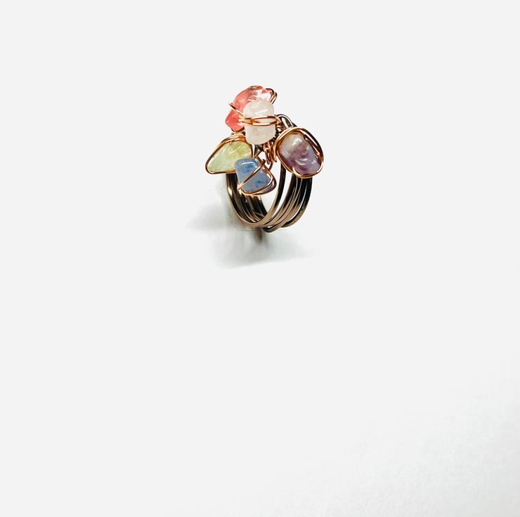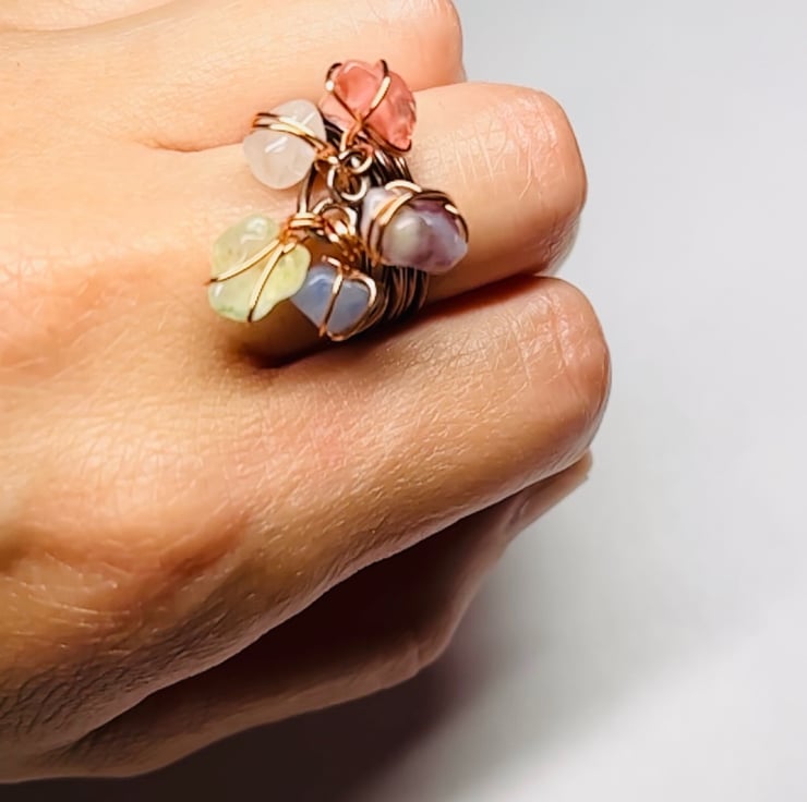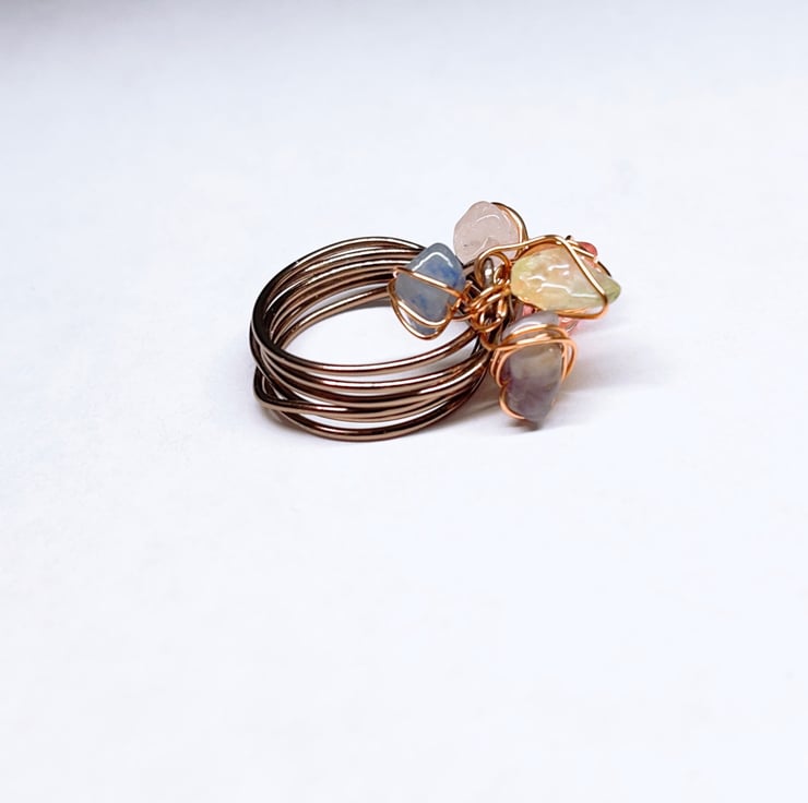 Moving Ring made with Clear Crystal Quartz, Rose Quartz, Amethyst, Blue Aventurine, Prehnite gems and Brown Aluminium Wire.