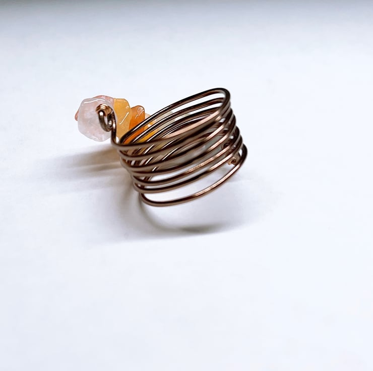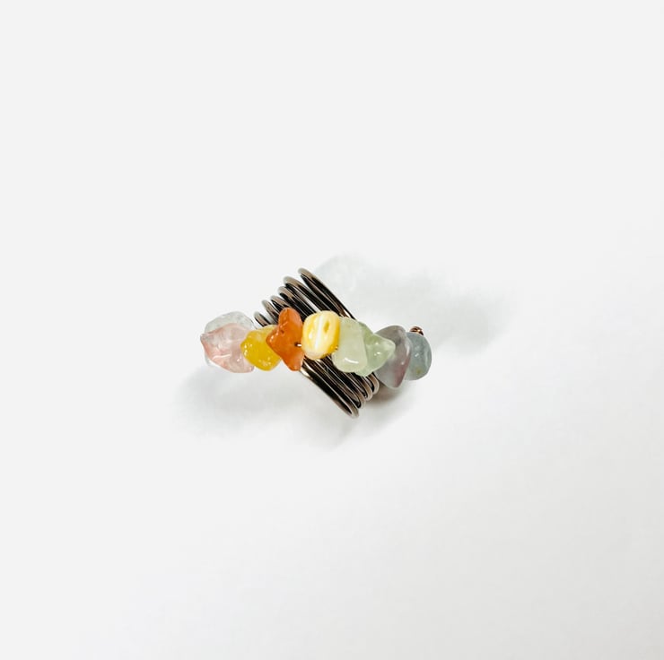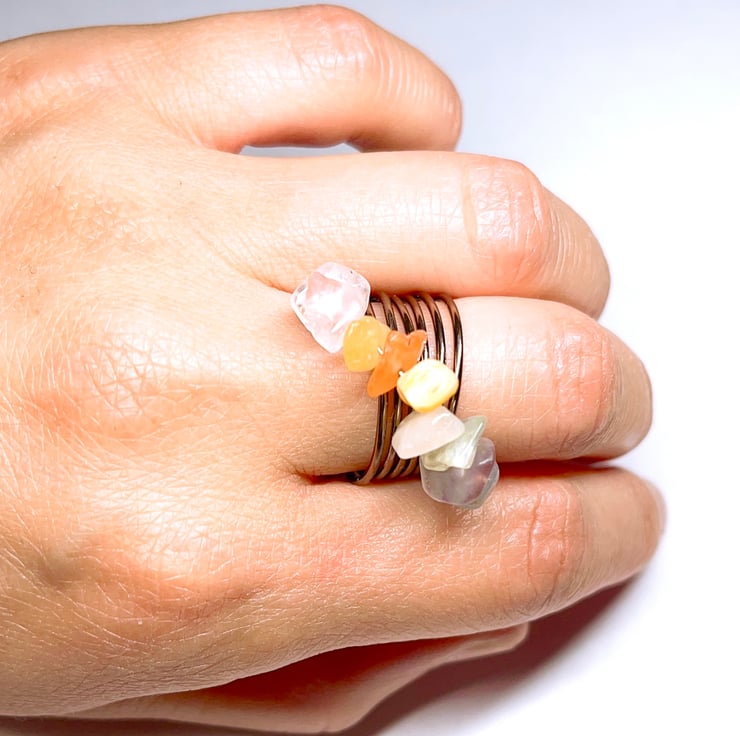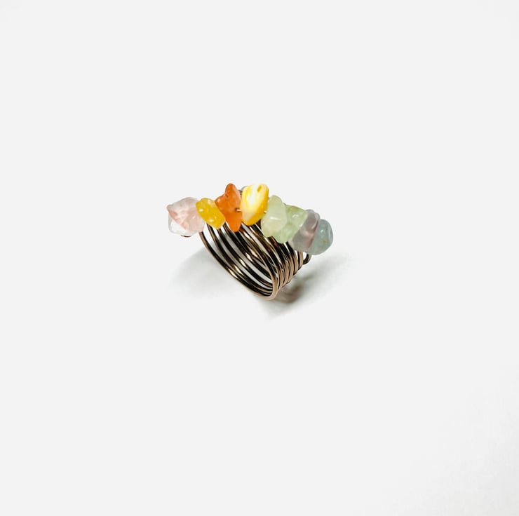 Rainbow Ring made with Clear Crystal Quartz, Rose Quartz, Yellow Aventurine, Southern Red Agate, White Coral, Amazonite, Amethyst, Blue Aventurine, Prehnite Gems and Brown Aluminium Wire.