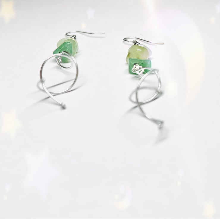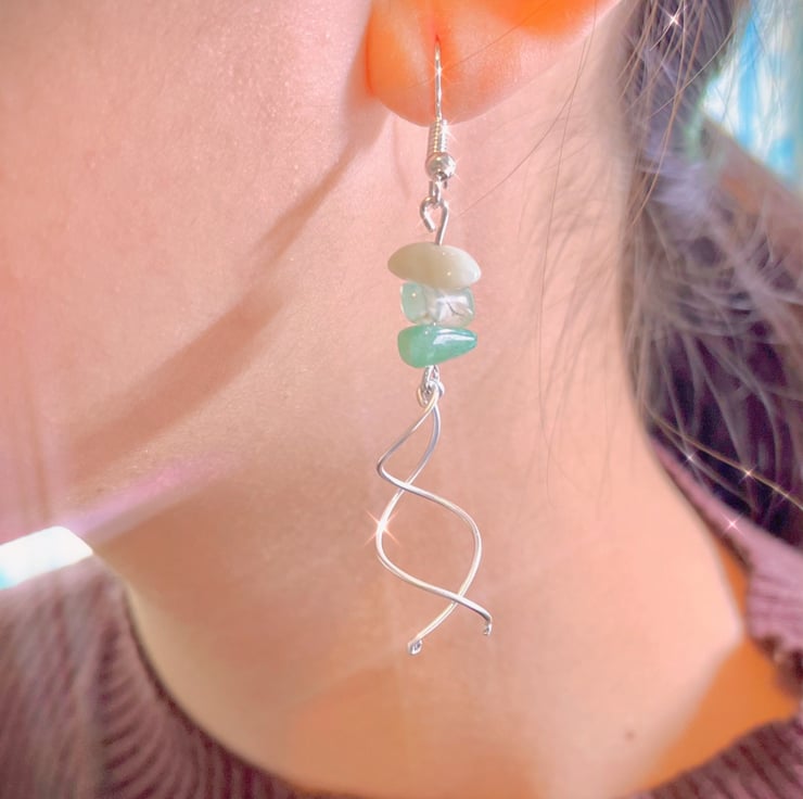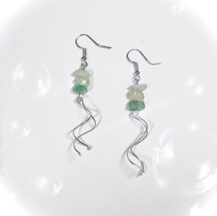 Earring made with free cutting Green Aveturine gem, Prehnite gem, Amazonite gem, Silver Aluminium Wire and Silver earring hooks.