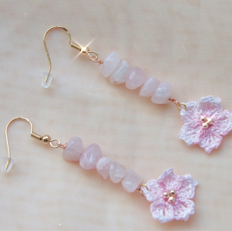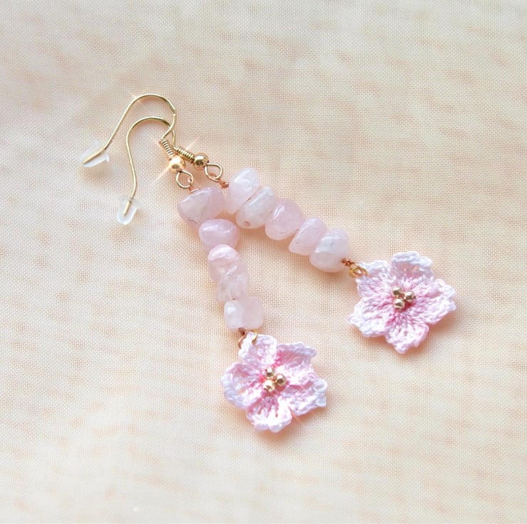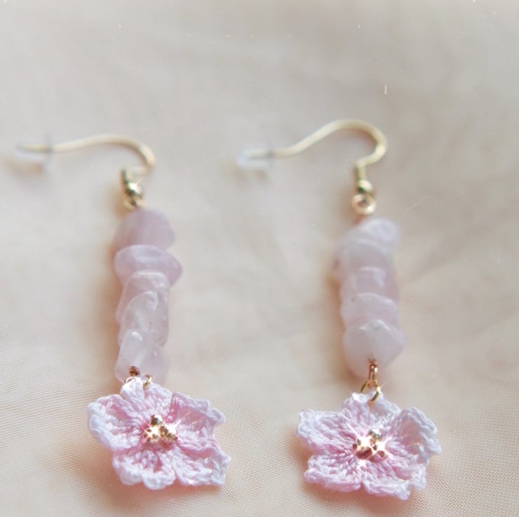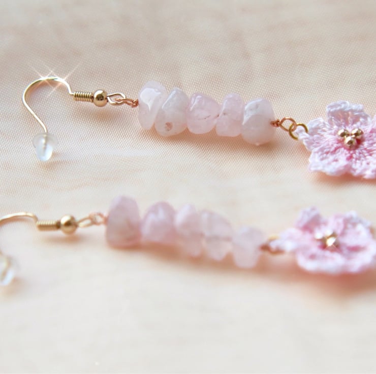 Earrings made with Rose Quartz Nuggets and Embroidery thread.