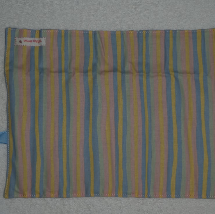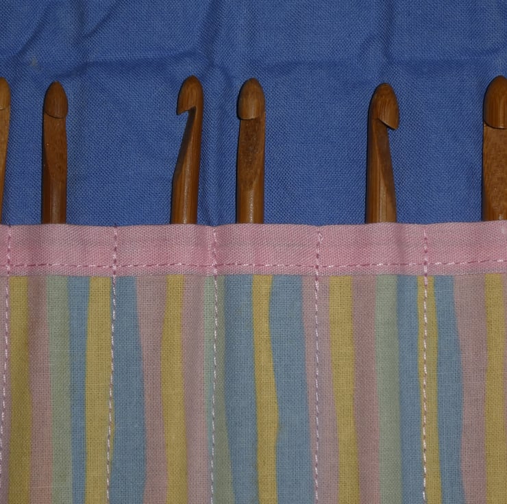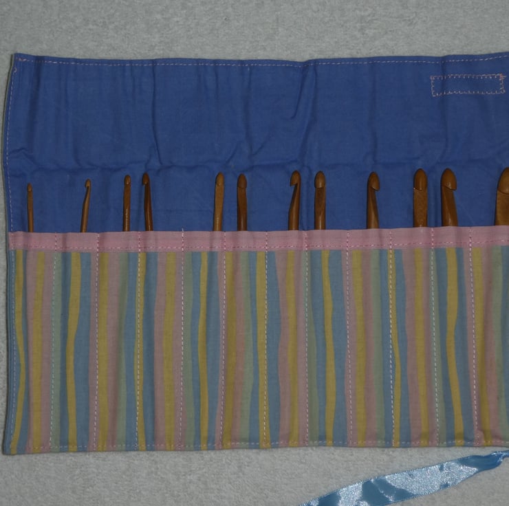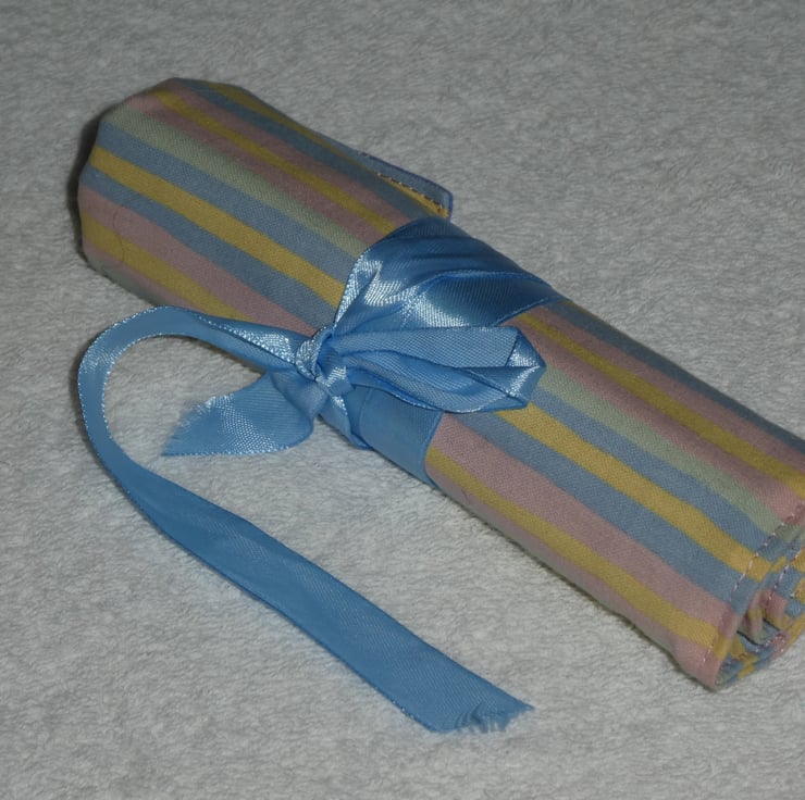 I have used a 100% cotton fabric to create this fantastic crochet hook case. It is sewn from a lovely pastel stripe print fabric with a plain blue cotton lining and has a blue ribbon tie.