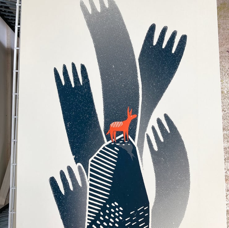 This is one of a continuing series of prints that I have made focussed on donkeys and their adventures in a strange and abstracted place. This print featured a magic donkey and some helping hands, perhaps a strange donkey dream, perhaps in the most surreal part of their donkey world? Only the donkeys know...